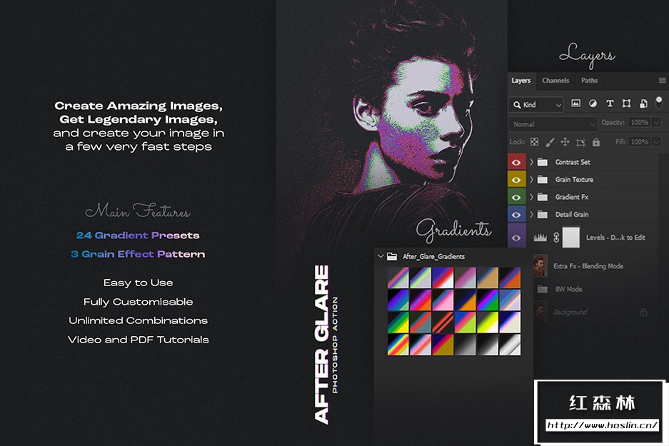 关于产品:After Glare Photoshop Action 用于创建惊人的效果,获取传奇图像,并通过几个非常快速的步骤创建您的图像。