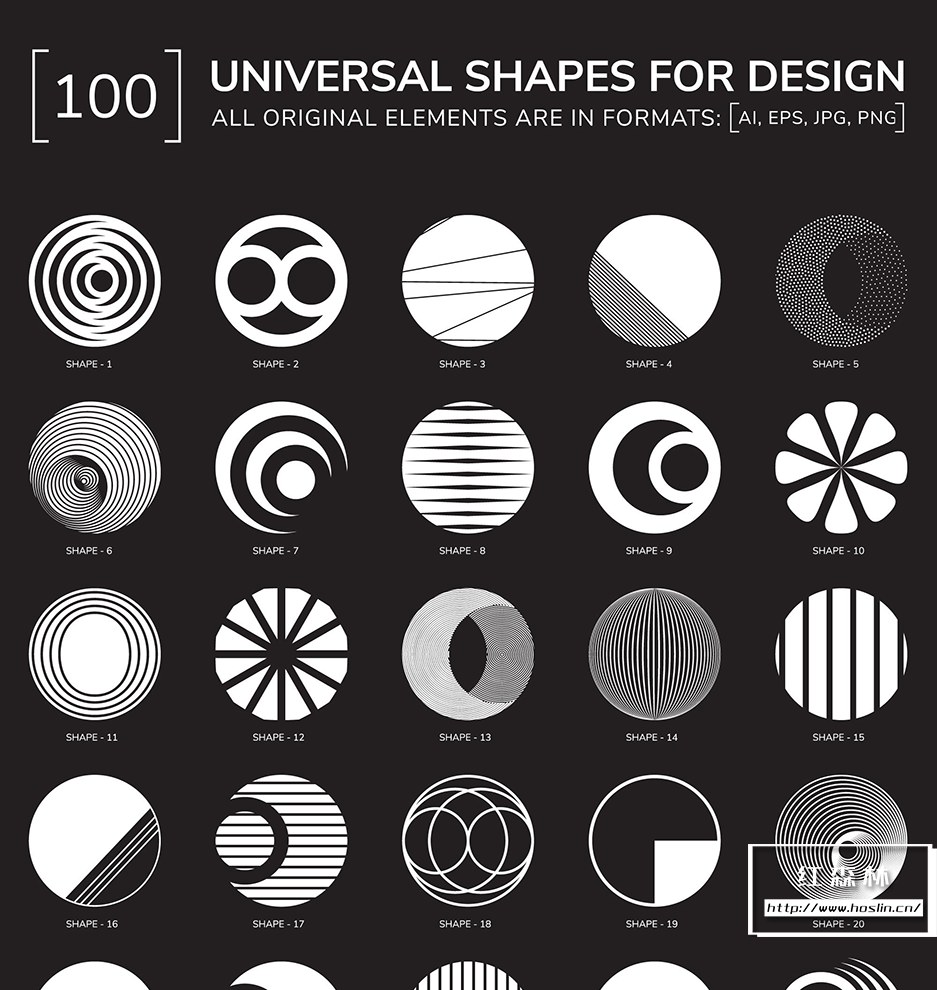- EPS10 中的 110 个文件(100 个形状 + 10 个无缝图案),RGB