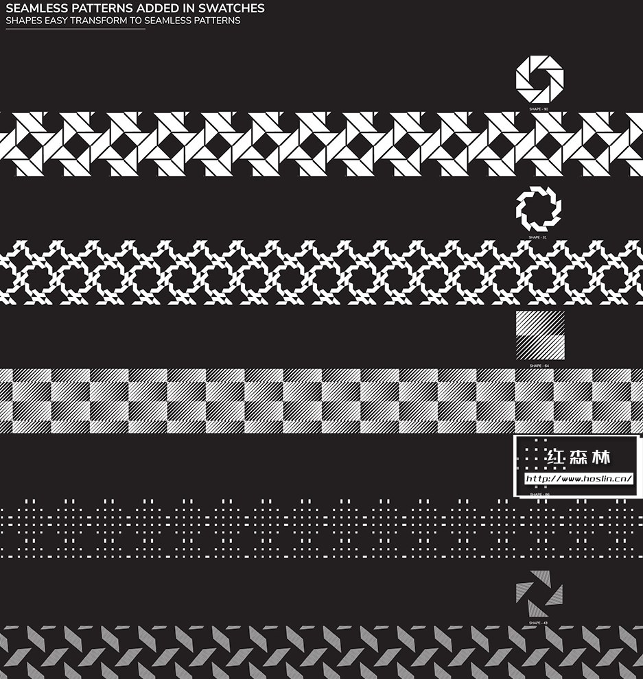 - 1 个 AI 文件(100 个形状 + 10 个无缝图案),RGB