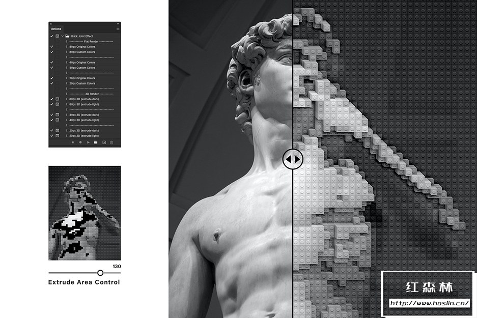 受乐高启发,该动作让您立即获得有趣的玩具 3d 积木效果!Brick Joint Action 使用原始源图像颜色来渲染效果。它带有平面/3D 渲染模式、3 种块大小和超过 15 个预设。通过定义您想要挤出的区域来创建无穷无尽的变化。
