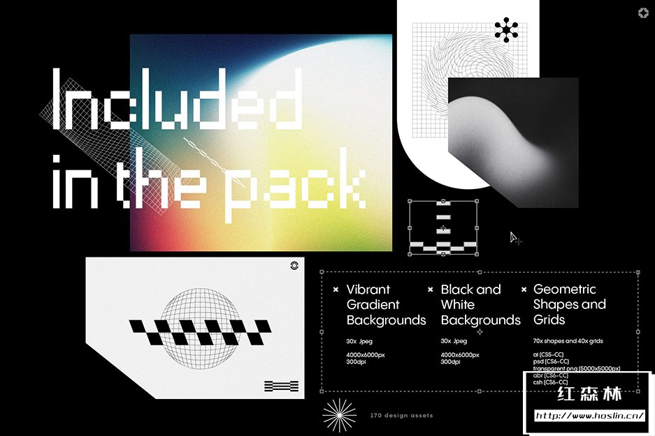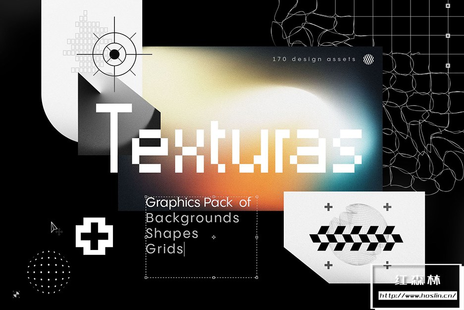 Texturas包含 30 个充满活力的复古渐变、30 个黑白背景、70 个抽象简约形状和 40 个扭曲网格。非常适合快速、引人注目的设计。所有资产都可以很好地协同工作,也可以单独使用。