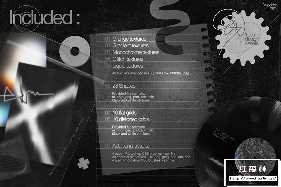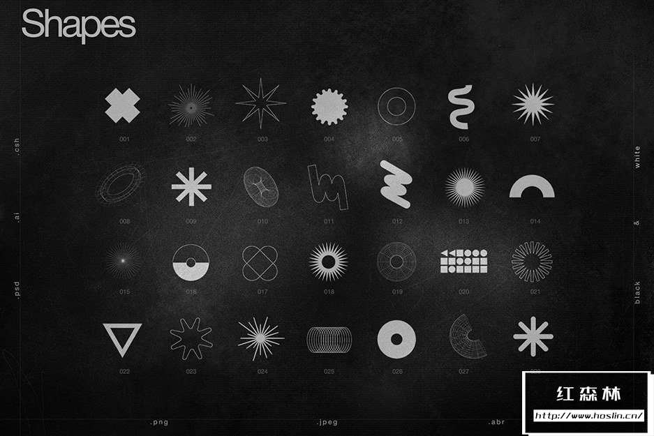 提供的文件格式:ai(CS5-CC)、png、jpeg、psd(CS6-CC)、abr、csh;黑色和白色版本