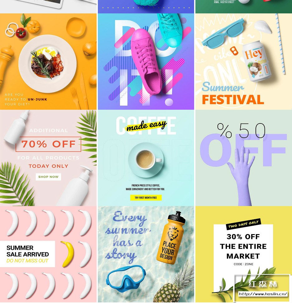 您可以将它们重新涂成您想要的任何颜色,添加您自己的产品标签,混合搭配和组合这些对象,设计出与众不同的漂亮横幅。如果您不是设计师,不用担心,我们已经为您创建了大量模板,设计精美,只需单击一下即可进行自定义,继续吧,将您的世界涂成您喜欢的颜色。