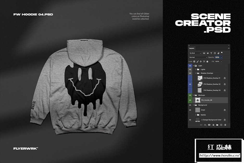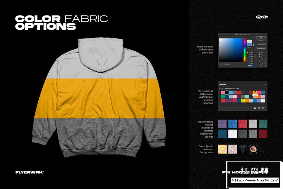 借助 8 个真实模板和完整的 Gildan 颜色库,这套 Photoshop 模型可以轻松重现 Gildan 的任何面料。