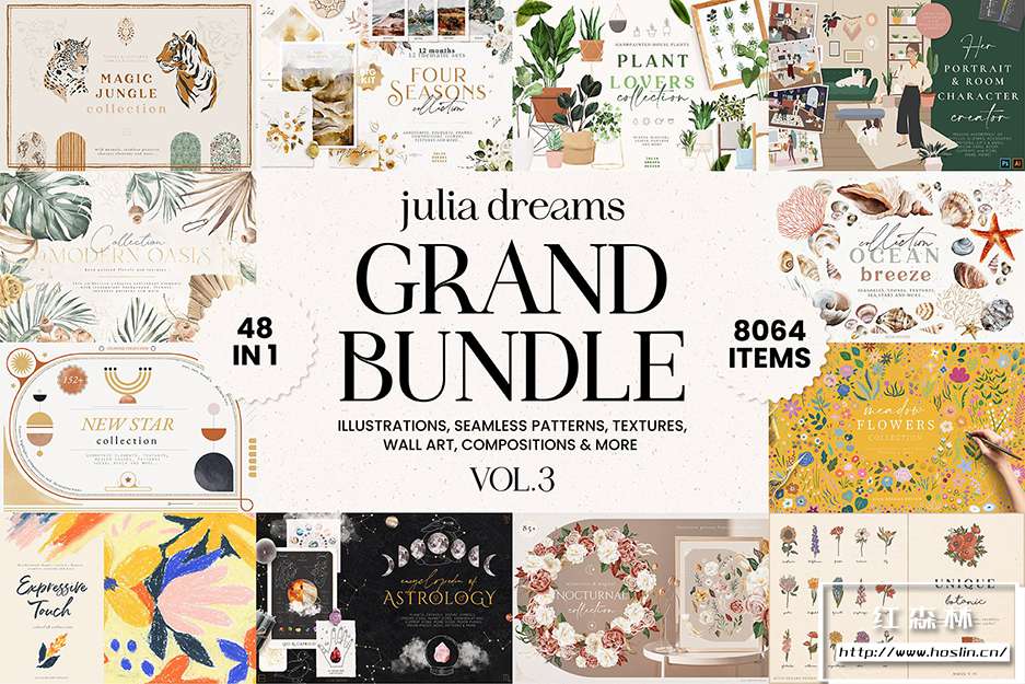 这个包中大约有8064 个元素。它是水彩元素、矢量元素、插图、对象、图案等等。