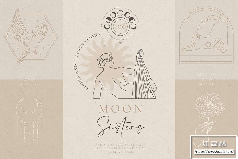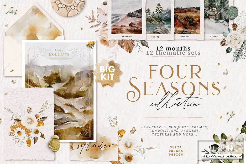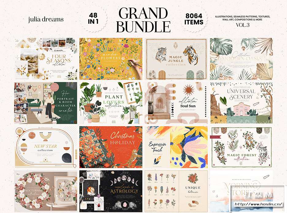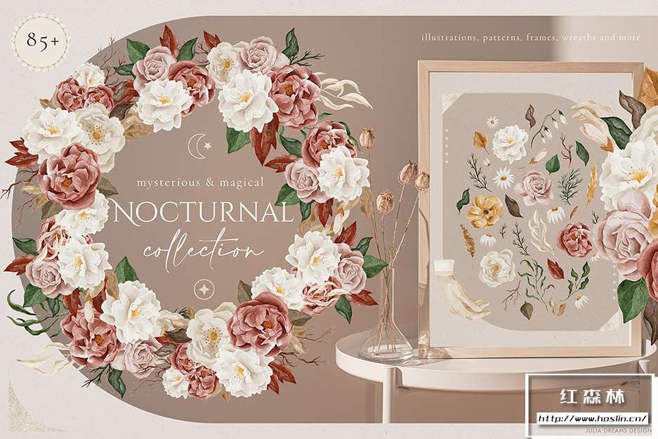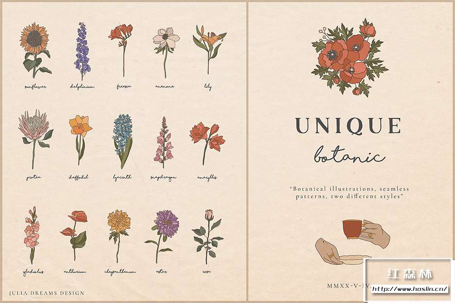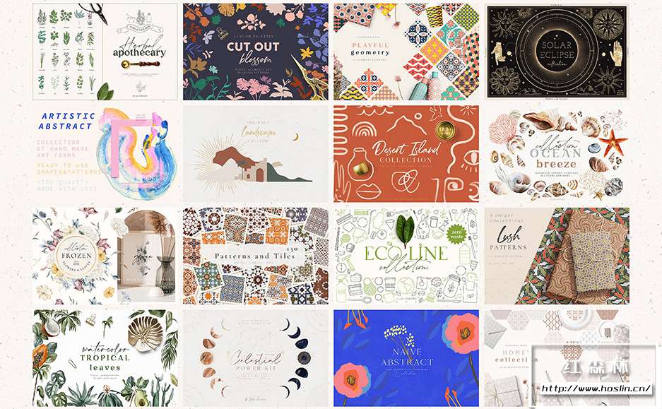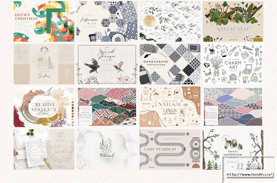 每个系列都包含一整套元素,可为您的项目创建完整的设计:插图、图案、装饰元素等。结合和混合元素来创建婚礼品牌或书籍封面,为您的商店创建徽标和包装纸,或打印图案并装饰家中的墙壁。您可以创建自己的设计。