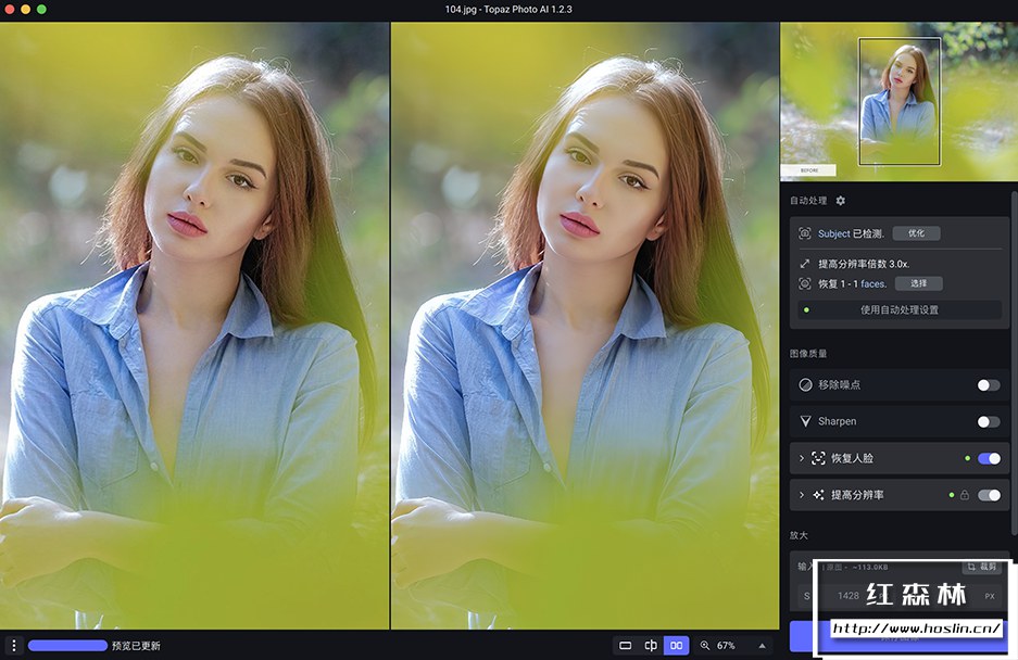 降噪(Topaz Denoise AI)在从数百万张图像中学习后,Topaz Photo AI 的降噪模块可以自动识别您图像的内容。它可以准确的确定真实图像细节和噪点之间的差异,准确度惊人。当然,并非所有图像都会有噪点,对于那些,Topaz Photo AI 将为您提供现代技术所能提供的最佳结果。