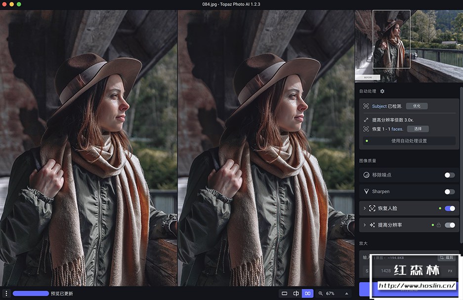 锐化(Topaz Sharpen AI)当您的主题模糊时,您并不一定有机会重拍。在这种情况下,请使用Topaz Photo AI 确保您的照片尽可能清晰。Sharpen AI 模块不像传统的锐化那样认为的增加边缘对比度,而是自然的逆转模糊的根本原因(相机抖动、运动模糊、对焦不正)以创造更自然的结果。在没有模糊的情况下,清晰度仍然存在 – 清晰的细节,没有边缘光晕或其他伪影。