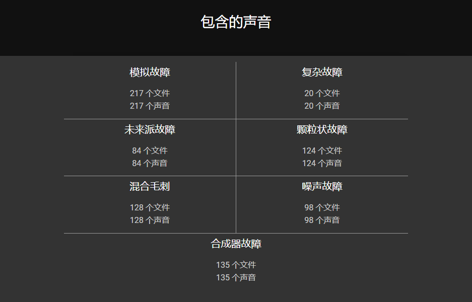 Glitches 拥有七大类共806个故障音效:模拟、复杂、未来派、颗粒状、混合、噪波、合成器故障音效。特别说明:音效为原版打包,类别已加入中文名;独立音效为纯英文名没有修改中文名,介意请勿购买!