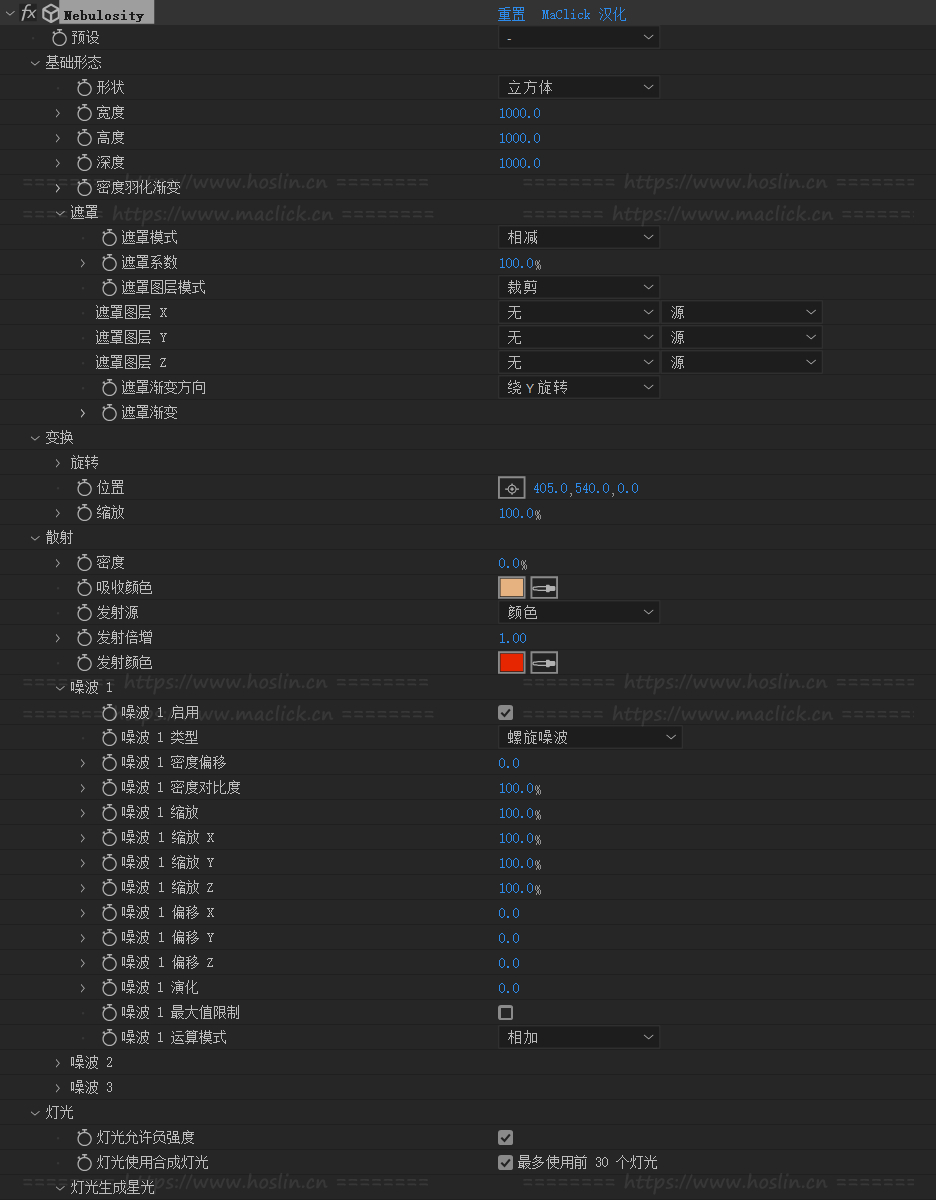 - 结合噪波:设置最多 3 层不同噪点的密度。散射噪点可以是三种不同的类型:体积噪波、螺旋噪波和反向 FBM 噪声。每个噪点都可以使用 Evolution 滑块进行微调和动画处理。