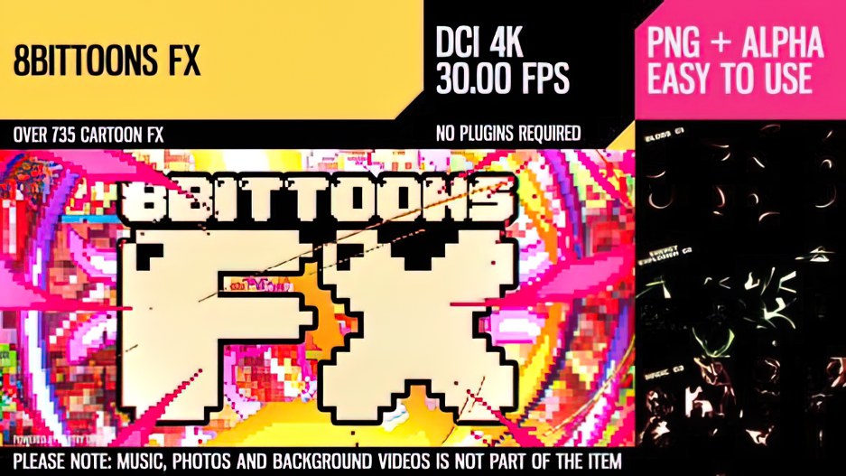 使用 8BitToons FX 回到 90 年代。8BitToons FX包含高清 UHD (1920*1080)、QuickTime(PNG、Alpha 通道、30fps)的 735×2 快速动画。为您的项目添加复古外观和现代动态。您可以自定义颜色并在流行软件中添加一些发光效果:After Effects、Premiere Pro、Edius、Final Cut、Vegas Pro、Resolume 等。所有效果均以两种变体呈现。