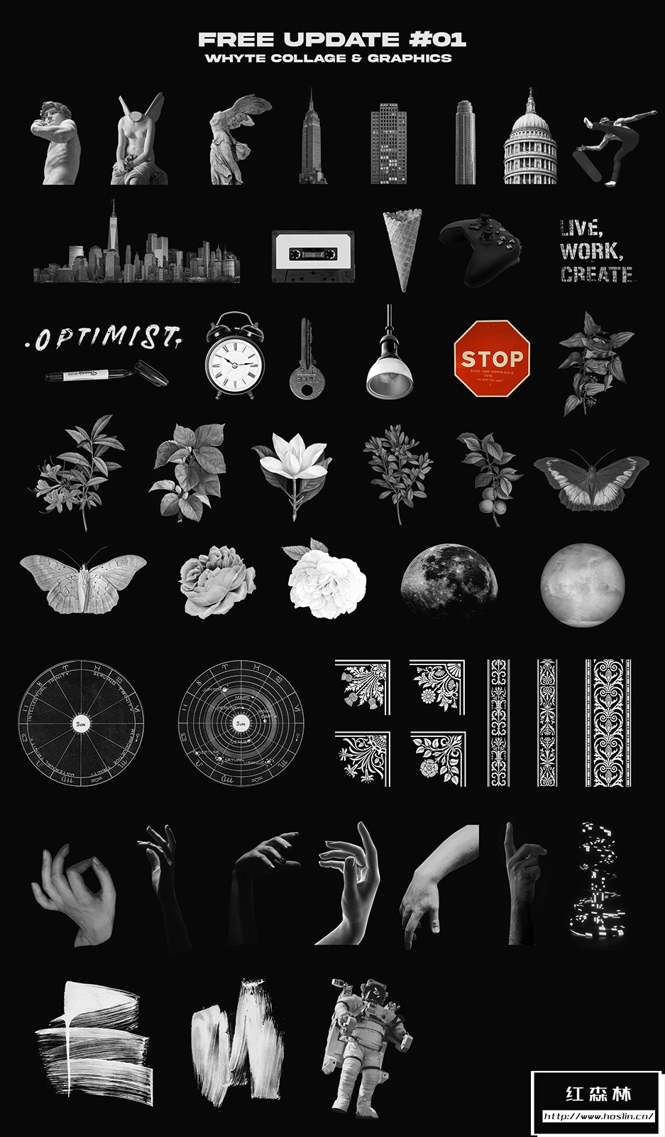 “WHYTE Collage and Graphics”是270 多种独特且用途广泛的图形元素的集合,可提升任何设计项目。包装内包含雕塑、动物、植物、纹理、贴纸等多种剪纸元素。这些元素非常适合各种设计项目,例如印刷材料、社交媒体内容和服装品牌。图形是高分辨率的,可以轻松编辑和定制以满足您的特定需求。