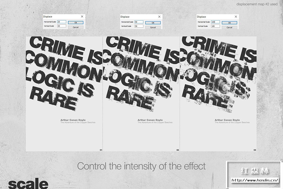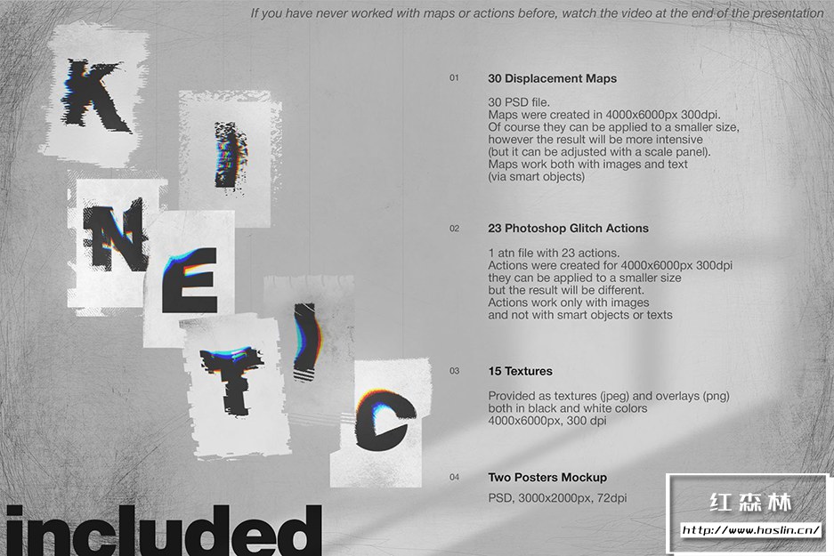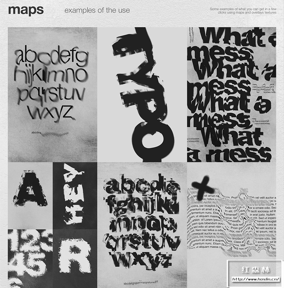 • 30张置换贴图- 30张PSD文件(Photoshop CS6或更高版本):置换图以 4000x6000px 300dpi 创建。当然,它们可以应用于较小的尺寸,但结果会更加密集(但可以使用比例面板进行调整)。地图同时处理图像和文本(通过智能对象)。置换图的尺寸​​较大,但对于高分辨率的印刷设计来说是必要的。