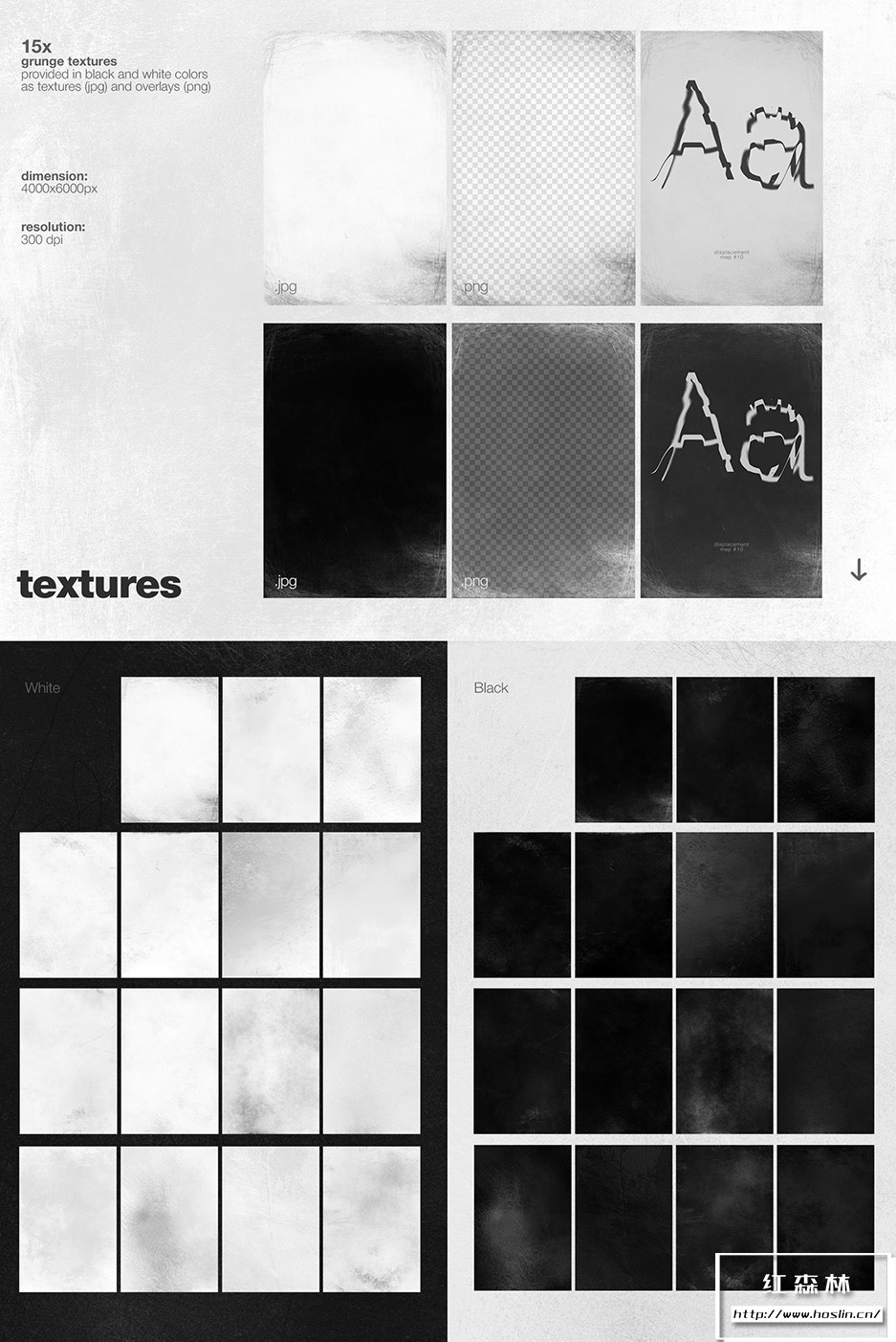 • 15 种纹理- JPEG、PNG:4000×6000 像素,300 dpi 以黑白两种颜色的纹理 (jpeg) 和叠加层 (png) 提供