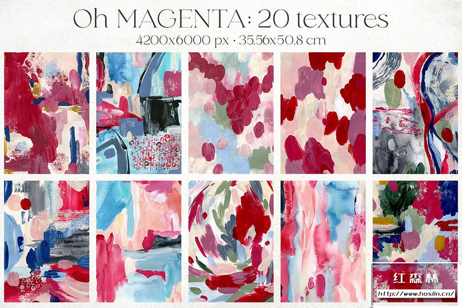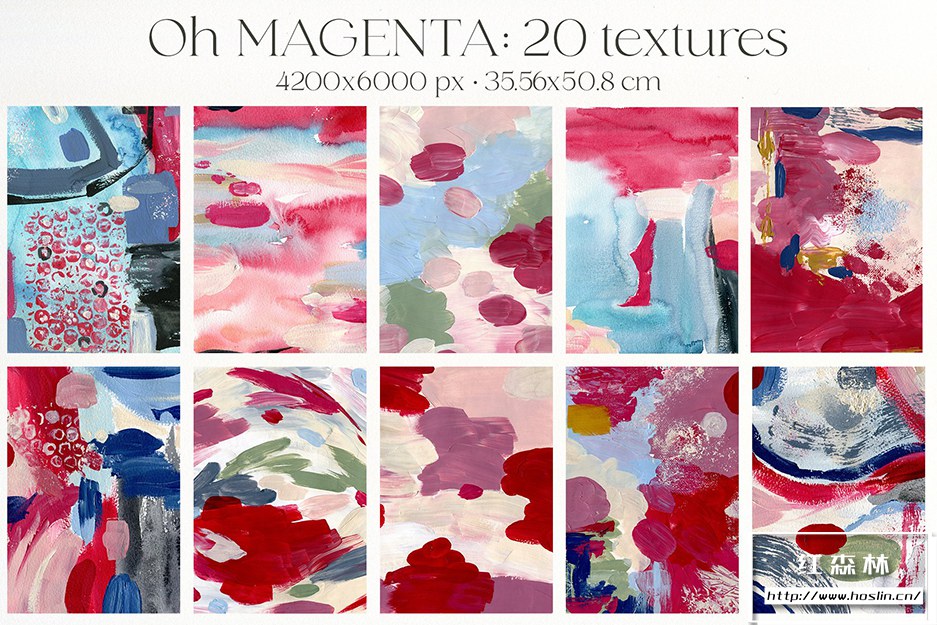 - 20 种丙烯酸和水彩纹理。尺寸 4200×6000 像素;JPG