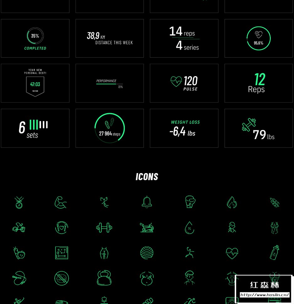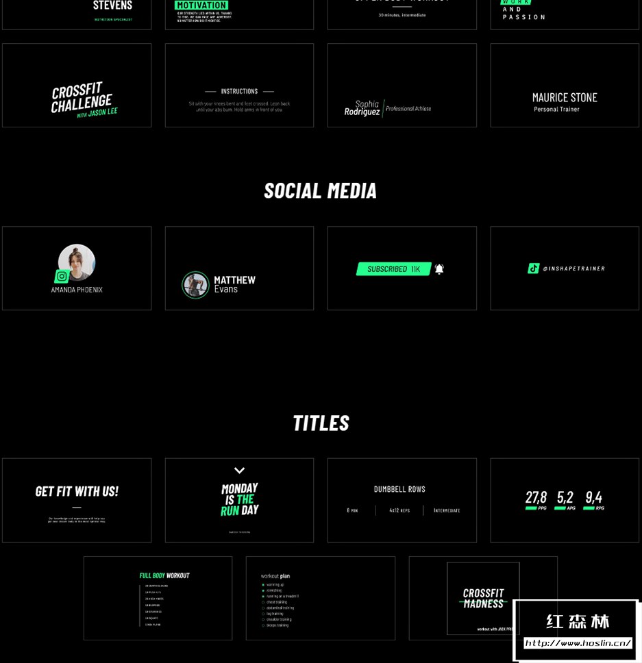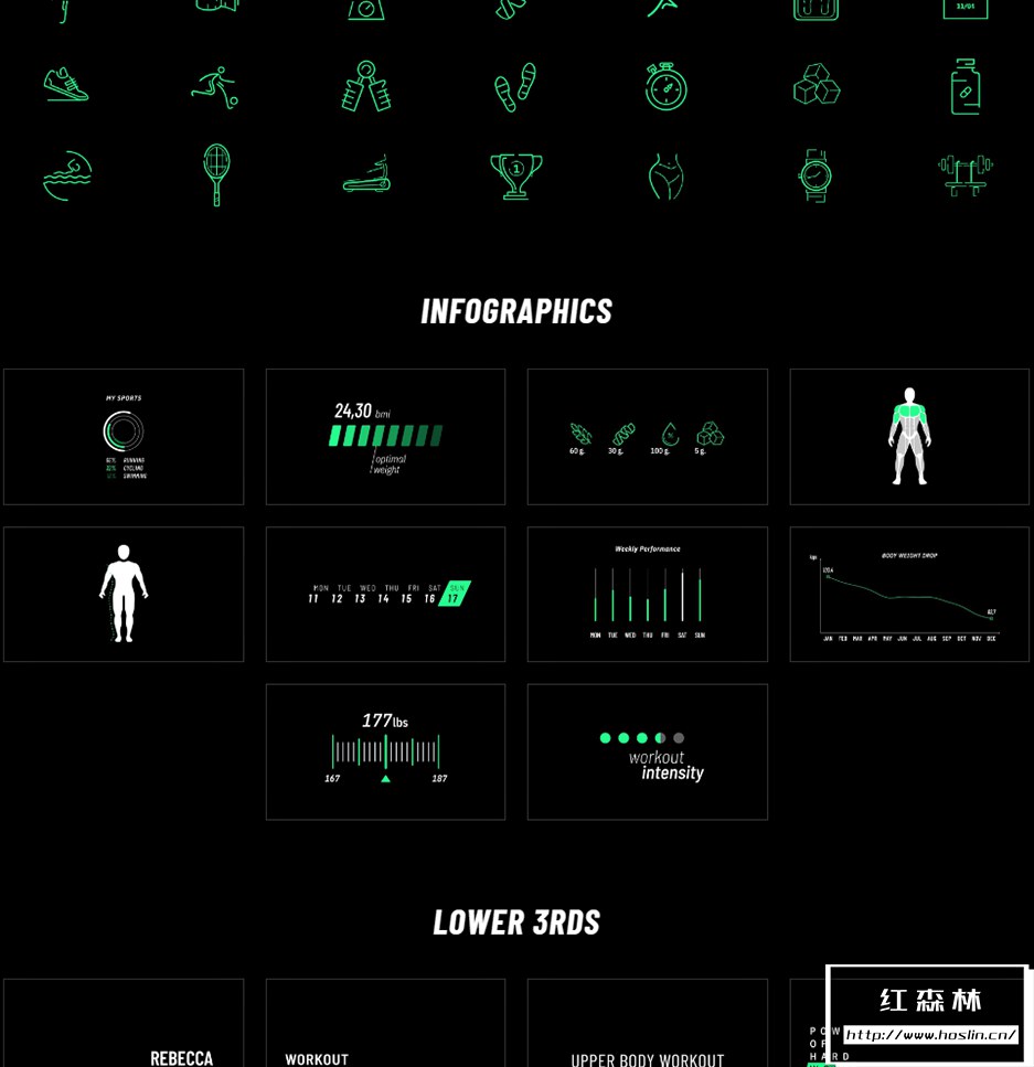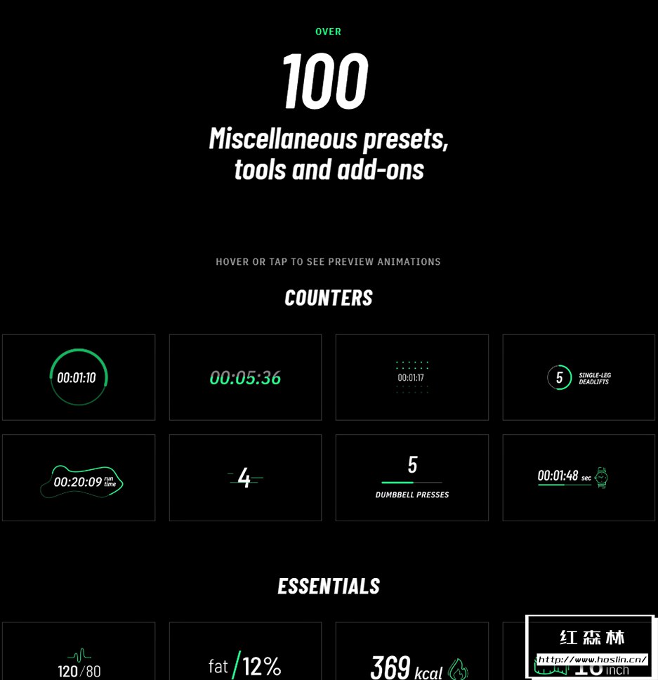 mFitness 拥有约106个动画预设,包含数字倒计时,计数器,图形数据,运动图标,文字标题字幕条等。带出入动画(可关闭),能修改文字,颜色,大小位置等属性。