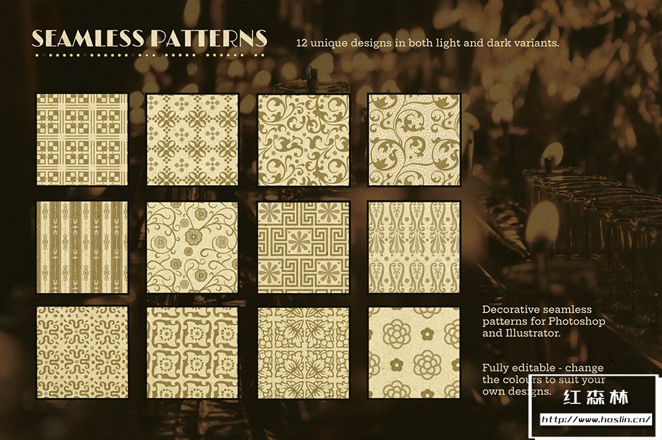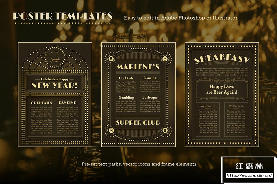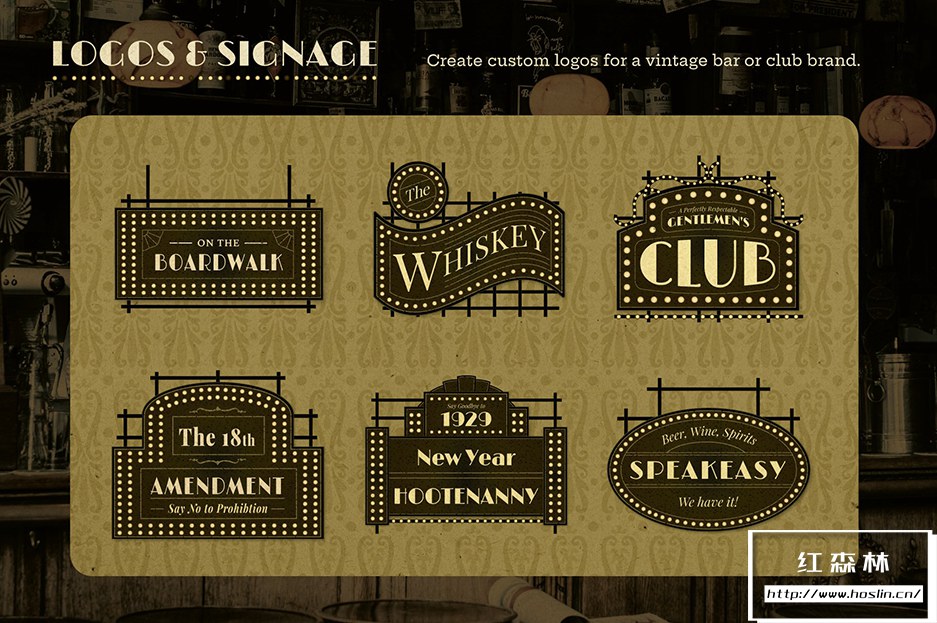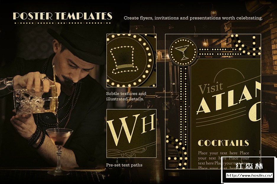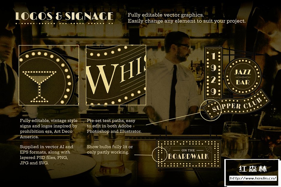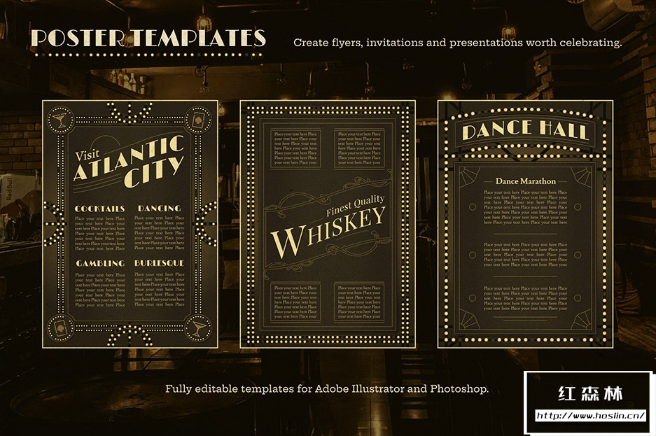 对于经典美国酒吧、舞厅和爵士乐俱乐部的粉丝来说,这是一个完美的模板集合,可帮助您创建自己的绝妙设计。借助预设的文本路径、矢量图案、纹理、插图元素和可变灯泡布局(有关更多信息,请参见下方视觉效果),此包是为复古主题活动创建海报、网站或品牌的任何人的绝佳资源。