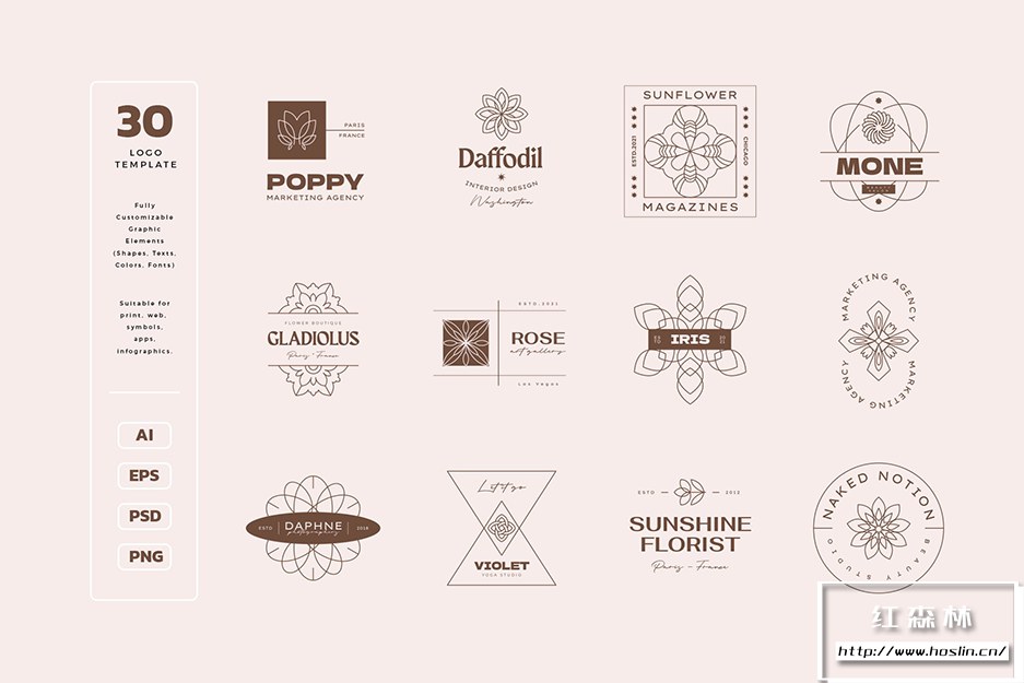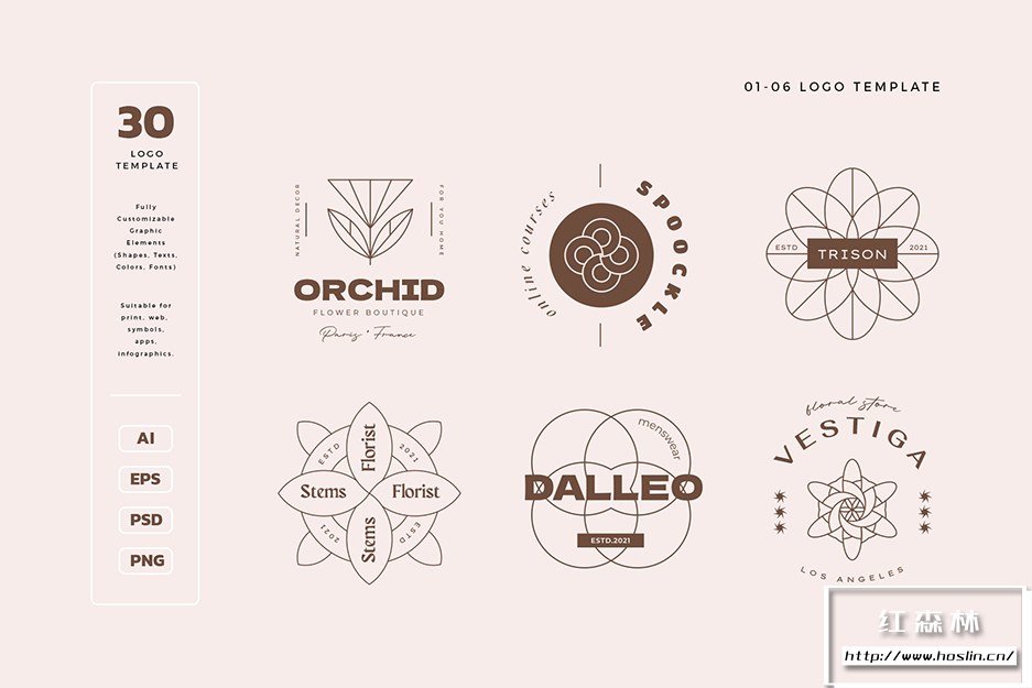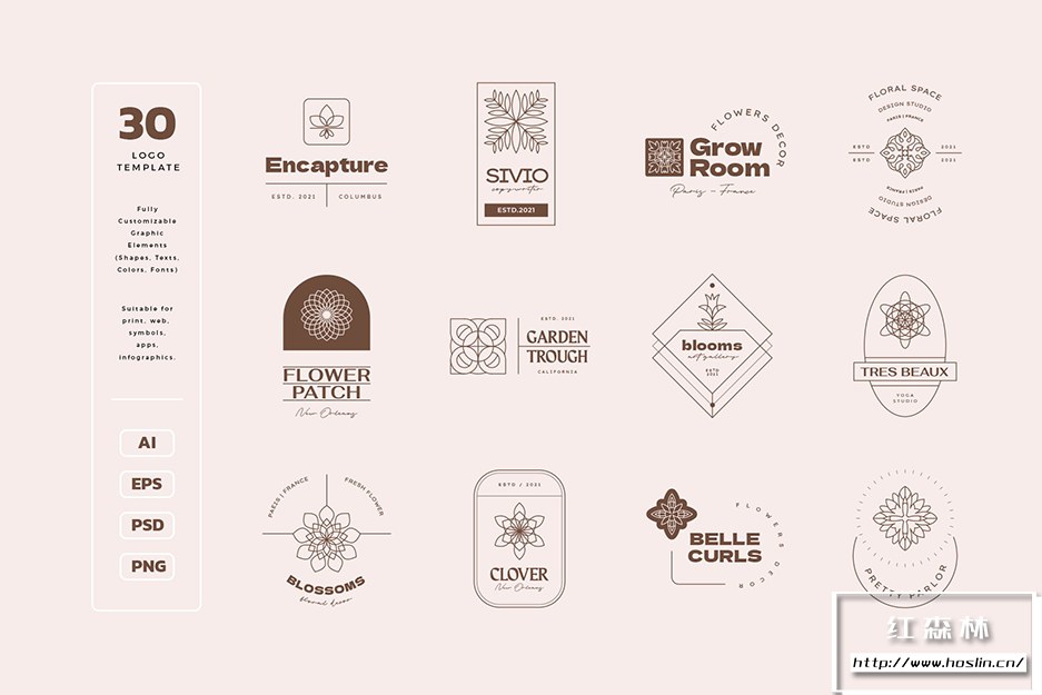 精心手工制作的几何花卉图标和徽标模板,适用于建筑公司、房地产代理、SEO 专家、内容经理、撰稿人、银行、金融服务、能源、投资、电信、保险、金融公司、电子商店、信息技术、汽车沙龙、洗车、大众媒体、在线课程、医疗服务、机器人技术、化妆品品牌、美容行业、时尚、造型师、婚庆公司、瑜伽馆、花卉精品店、服装店、杂志、摄影师、室内设计、创意机构、艺术画廊、建筑公司、营销机构、博客、男装、时尚精品店、花卉精品店或任何可能的创意领域。
