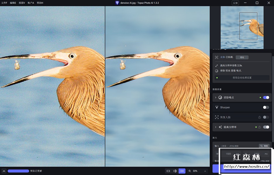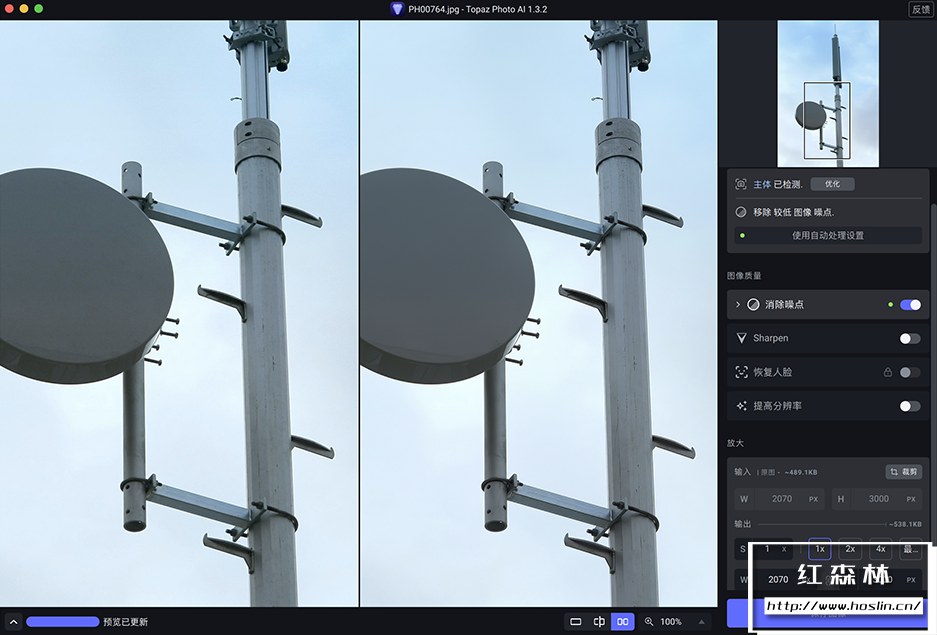 降噪(Topaz Denoise AI)在从数百万张图像中学习后,Topaz Photo AI 的降噪模块可以自动识别您图像的内容。它可以准确的确定真实图像细节和噪点之间的差异,准确度惊人。当然,并非所有图像都会有噪点,对于那些,Topaz Photo AI 将为您提供现代技术所能提供的最佳结果。