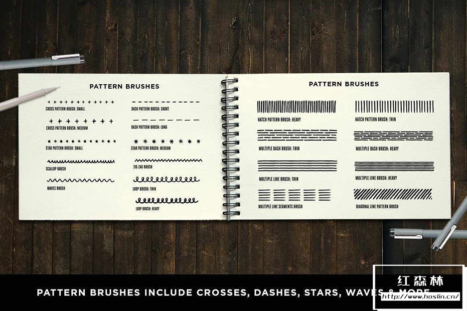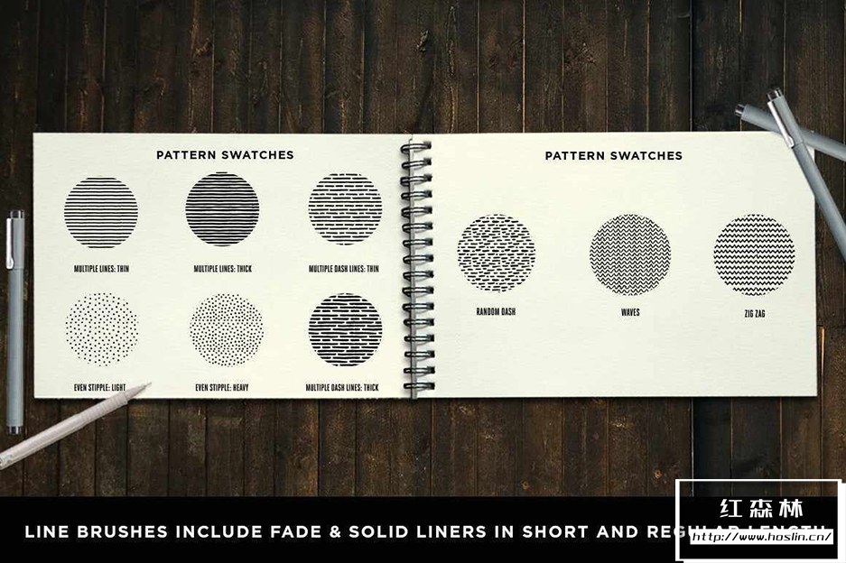 使用这组适用于Adobe Illustrator 的图案、线条和散点画笔,为您的作品赋予手绘精细线条笔外观。