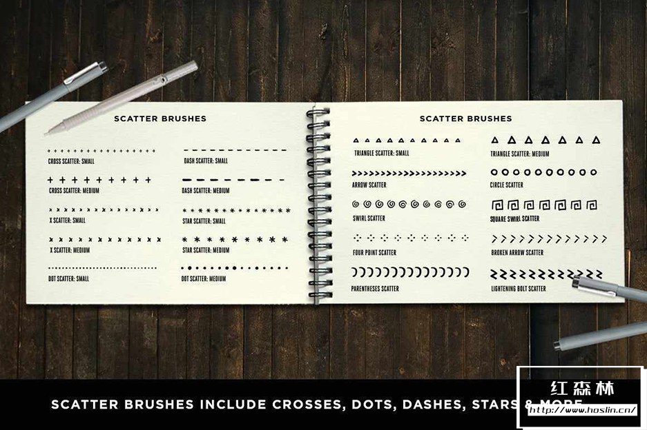 - 20 个散点画笔,包括圆点、星形、十字形等等。