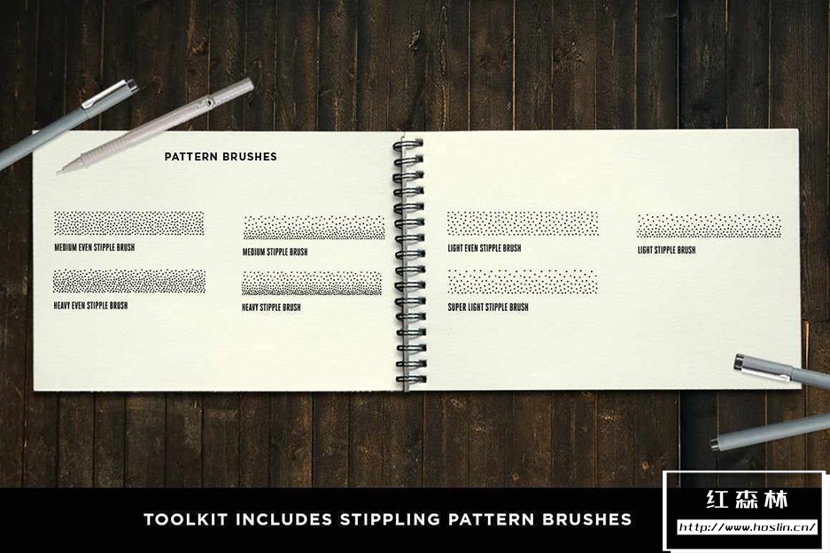 - 62 支手绘细线笔笔刷,包括图案、线条、散点笔刷和色板。