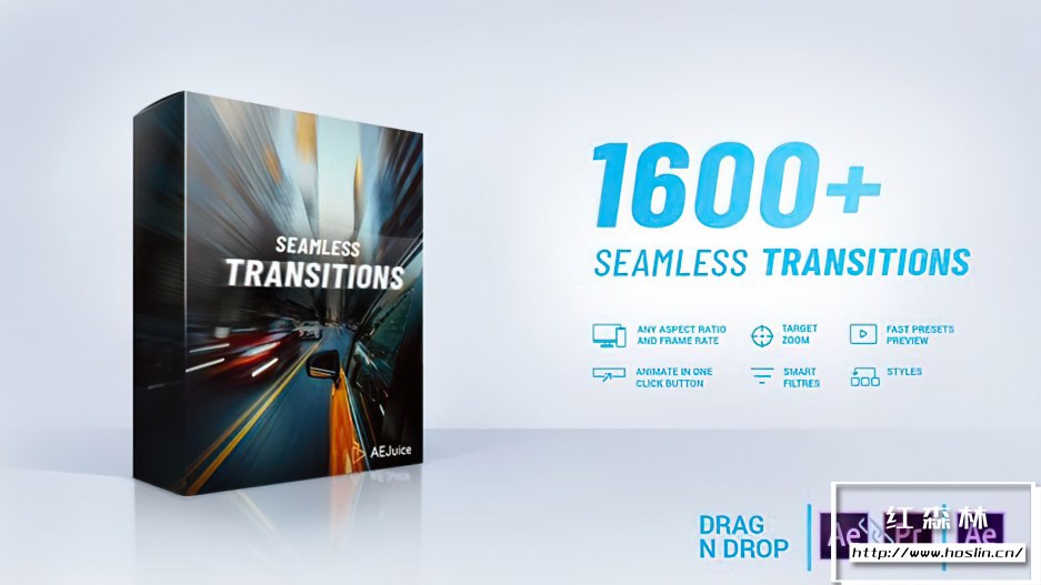 Seamless Transitions Legacy 包括15个类别(基本过渡、模糊、淡入淡出、鱼眼、光晕、形状、故障、冲击、镜头、偏移、像素化、抖动、拉伸、标签、光标、变形),声音效果内置于每个过渡中。使用简单,拖放到时间线即可看到效果。