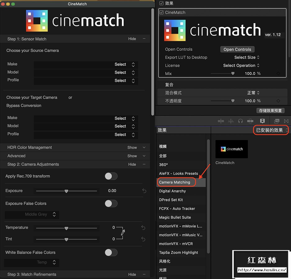 摄影机色彩空间匹配工具 CineMatch 终于有FCP版本了,这是一个快速,简单的解决方案,适用于剪辑师、调色师、DIT和摄影师,帮助你在一个时间轴上匹配来自不同摄像机来源的素材而无需预先转码或渲染。使用专用摄像机包,CineMatch可将你的镜头从一种Log风格转换为另一种。如S-Log2/3、C-Log、B-Raw、V-Log/L、RED IPP2等之间进行混合和匹配,只需再点击一下就能应用正确的Rec.709转换。CineMatch除了可以转换色彩空间之外,还自带了常规曲线、色相vs色相曲线以及LGG色轮等工具。