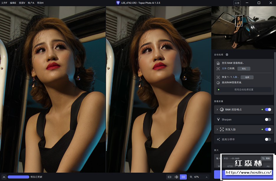 降噪(Topaz Denoise AI)在从数百万张图像中学习后,Topaz Photo AI 的降噪模块可以自动识别您图像的内容。它可以准确的确定真实图像细节和噪点之间的差异,准确度惊人。当然,并非所有图像都会有噪点,对于那些,Topaz Photo AI 将为您提供现代技术所能提供的最佳结果。
