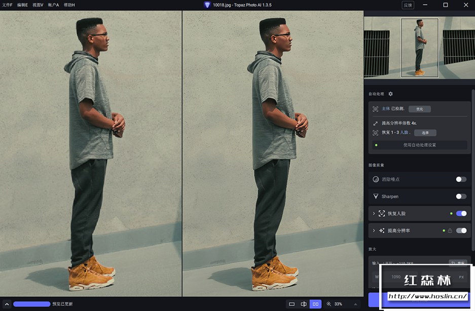 锐化(Topaz Sharpen AI)当您的主题模糊时,您并不一定有机会重拍。在这种情况下,请使用Topaz Photo AI 确保您的照片尽可能清晰。Sharpen AI 模块不像传统的锐化那样认为的增加边缘对比度,而是自然的逆转模糊的根本原因(相机抖动、运动模糊、对焦不正)以创造更自然的结果。在没有模糊的情况下,清晰度仍然存在 – 清晰的细节,没有边缘光晕或其他伪影。