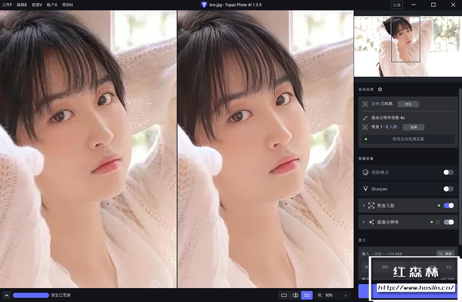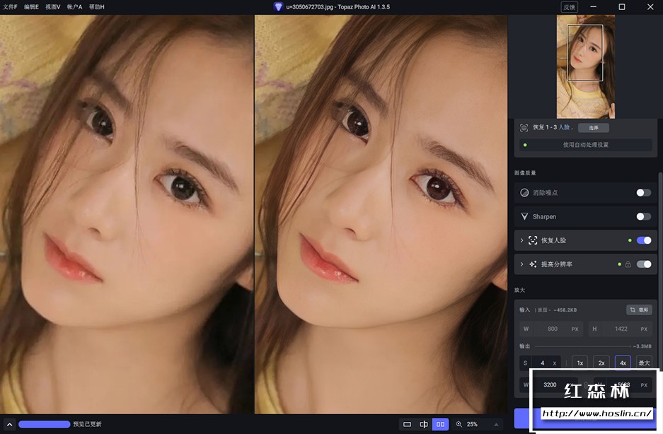 图像增强放大(Gigapixel AI)通常,放大低质量图像只会得到(更大的)低质量图像。而Topaz Photo AI 是不同的。放大时,它会记住数百万张相似图像中的真实细节,并根据这种理解自然地填充缺失的像素。这就像你如何在不亲临朋友面前的情况下描绘朋友的脸。这意味着您可以为您的照片添加真正的分辨率,以获得更紧密的裁剪或更鲜艳的打印效果,以及以前不可能的出色图像质量
