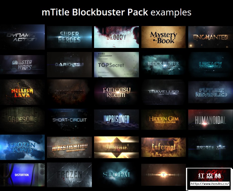mTitle Blockbuster Pack 是一组文字片头动画,非常大气震撼,我们在一些好莱坞电影中经常看见影片片头那种大气磅礴的文字片头,会有一种超强的视觉效果。mTitle Blockbuster Pack 包含30种不同的电影文字片头特效,修改文字即可使用。你还可以根据剧情或自己的需要做其他调整,以达到更完美的效果,操控和使用都非常简单,希望你的影片和好莱坞巨制一样专业,震撼和迷人!