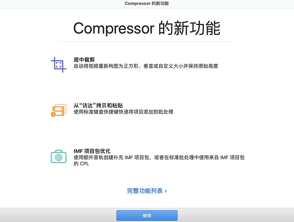 Compressor 是苹果推出的运行于Mac OS X的一款视频编辑软件,主要功能有格式支持、编码选项、图像序列支持、格式与标准转换等。Compressor 与Final Cut Pro 紧密集成,可添加自定义输出设置,分布式编码和广泛的交付功能。它支持360°视频,HDR,HEVC和MXF输出,是导出Final Cut Pro项目最强大,最灵活的方式。