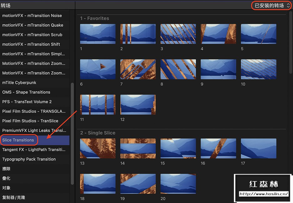 Slice Transitions 包含共62个图形遮罩分裂切割视频转场,可用于视频、图片、LOGO图层的转场;含32个独立音效,导入FCPX软件中可配合转场使用。简单易用,随附的视频教程可帮助您完成定制的每一步。