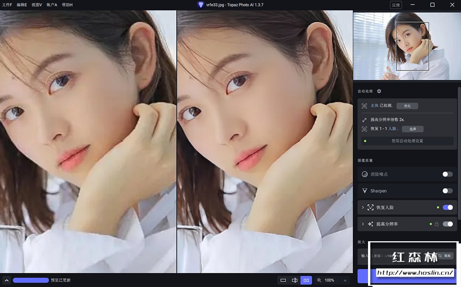 图像增强放大(Gigapixel AI)通常,放大低质量图像只会得到(更大的)低质量图像。而Topaz Photo AI 是不同的。放大时,它会记住数百万张相似图像中的真实细节,并根据这种理解自然地填充缺失的像素。这就像你如何在不亲临朋友面前的情况下描绘朋友的脸。这意味着您可以为您的照片添加真正的分辨率,以获得更紧密的裁剪或更鲜艳的打印效果,以及以前不可能的出色图像质量