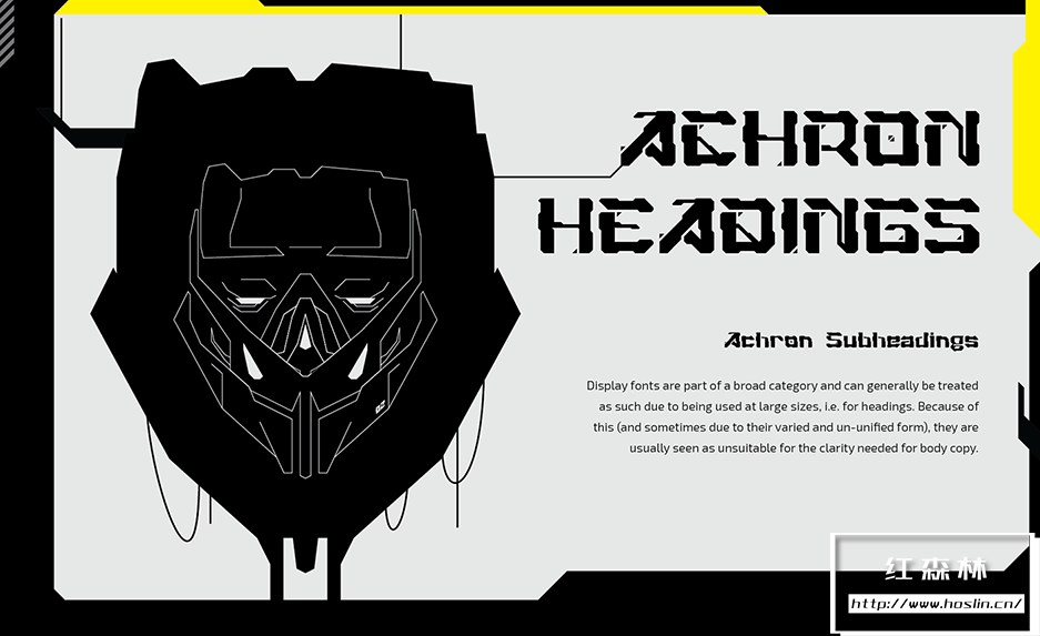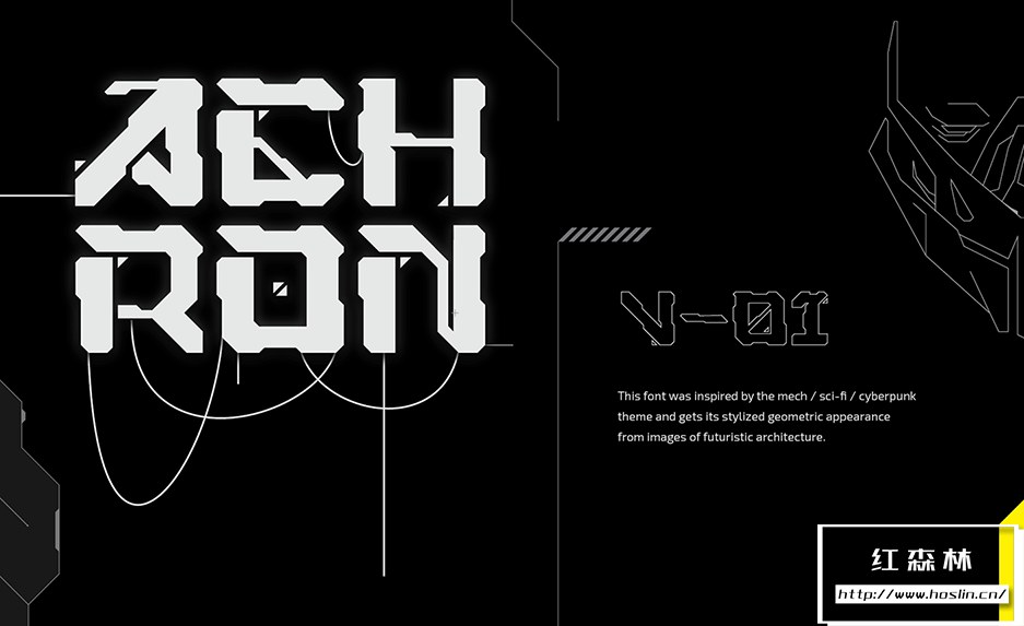 Achron显示字体的灵感来自机械和未来主义建筑,Achron 的设计具有对比鲜明的笔触和工业机器设计典型的 145° 几何硬角。字体硬朗,专门设计成大标题,适合科幻和赛博朋克题材。这些字体包含大写和小写字母、数字和 32 个标点符号,改字体还带有一组小写字符,大写和小写非常适合标题和副标题或较小的正文文本。