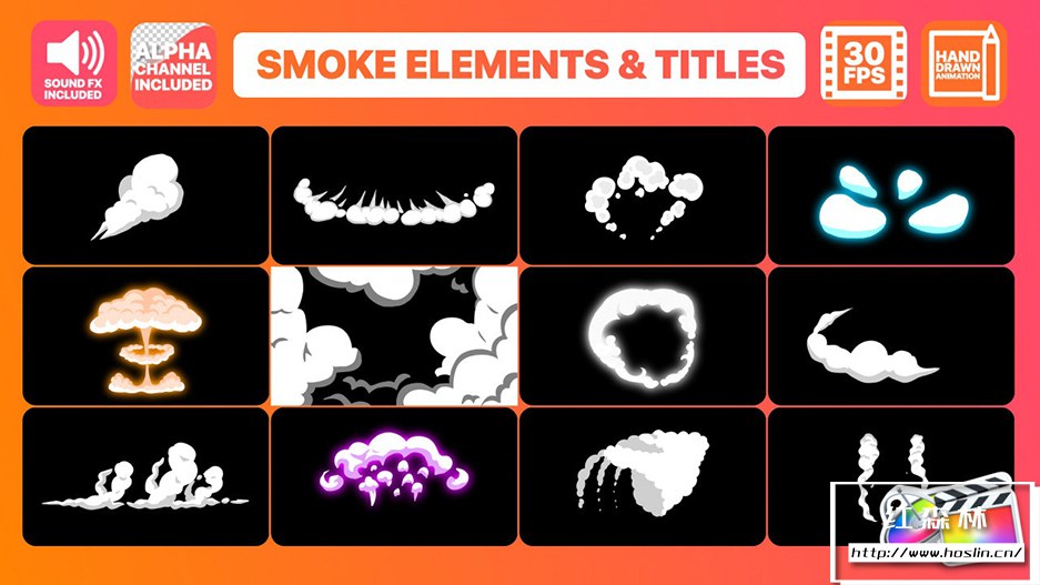 2DFX Smoke Elements And Titles 包含独特设计和创造性动画的手绘烟雾元素、过渡和标题。它非常易于使用和编辑。使用全彩和发光控制器,快速设计它以匹配您自己的品牌。社交媒体视频、宣传片、商业广告、片头、开场白和任何其他寻求喜爱的创意剪辑。2DFX Smoke Elements And Titles 一共包含12个二维卡通手绘烟雾MG动画+3个文字标题动画,元素可以随意组合搭配,可以修改颜色,和添加Glow发光以及修改发光颜色。