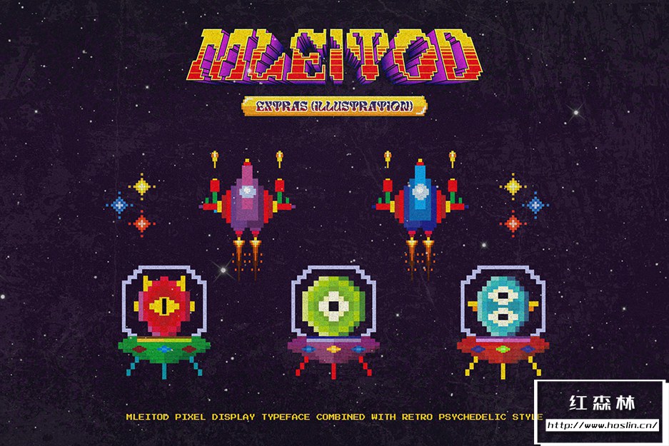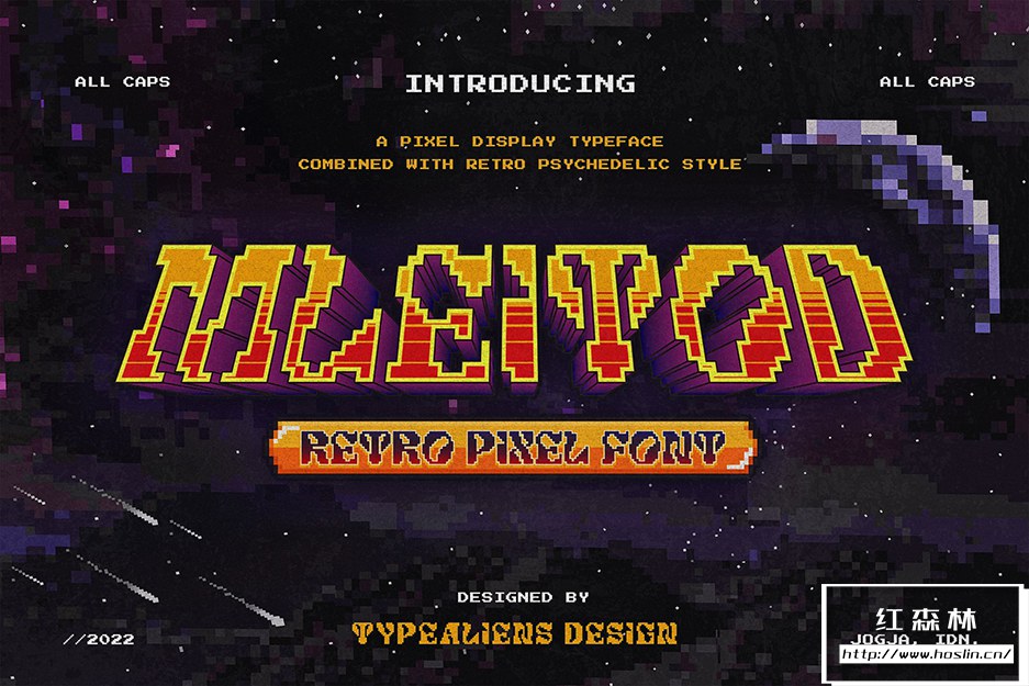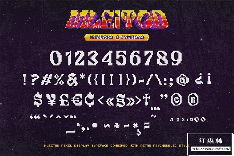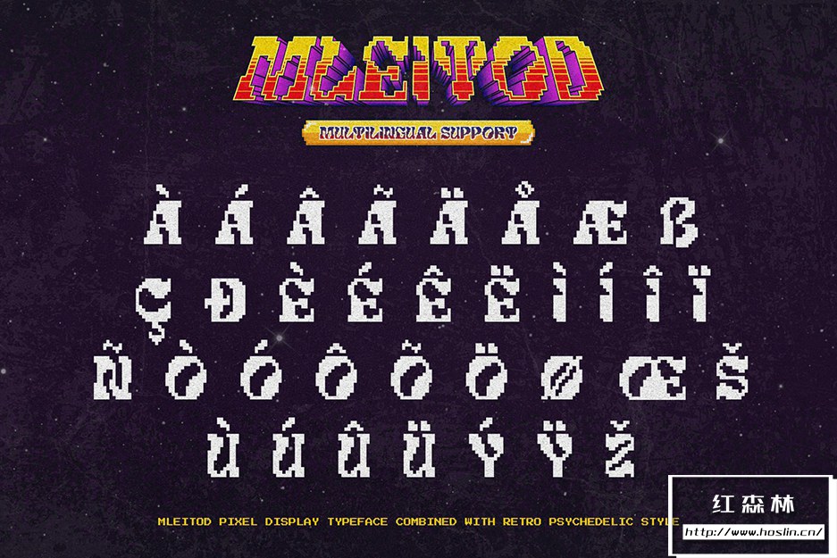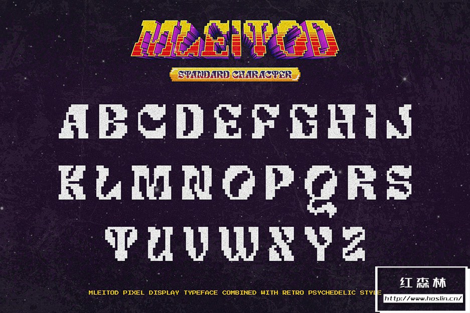 Mleitod 是一种基于粗体衬线的显示字体,结合了迷幻风格,并赋予了游戏中的低像素效果。凭借其像素化笔划特征,该字体非常适合不同或独特的设计,例如游戏或乐队和音乐活动海报。