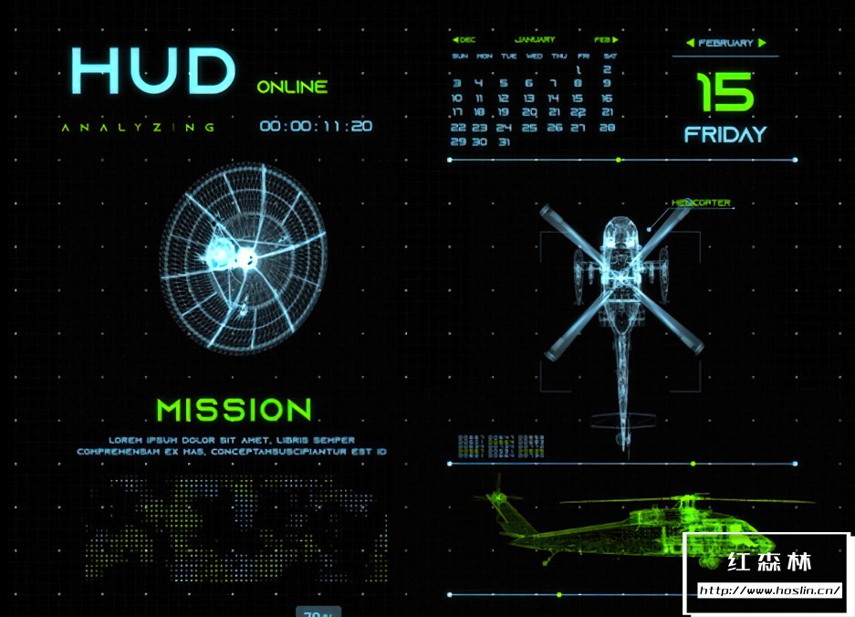 HUD Military 是一套未来科幻风格的全息投影军事UI界面HUD元素模板,它可以帮助您快速创建一个炫酷的军事界面。它包含了多种HUD元素,例如地图、武器、飞机等,可以用于制作各种军事场景,例如战斗指挥、飞行控制等。此外,该模板还包含了多种动画效果,可以让您的界面更加生动、逼真。无论您是制作科幻电影、游戏还是其他相关的项目,HUD Military 都是一个非常不错的选择。