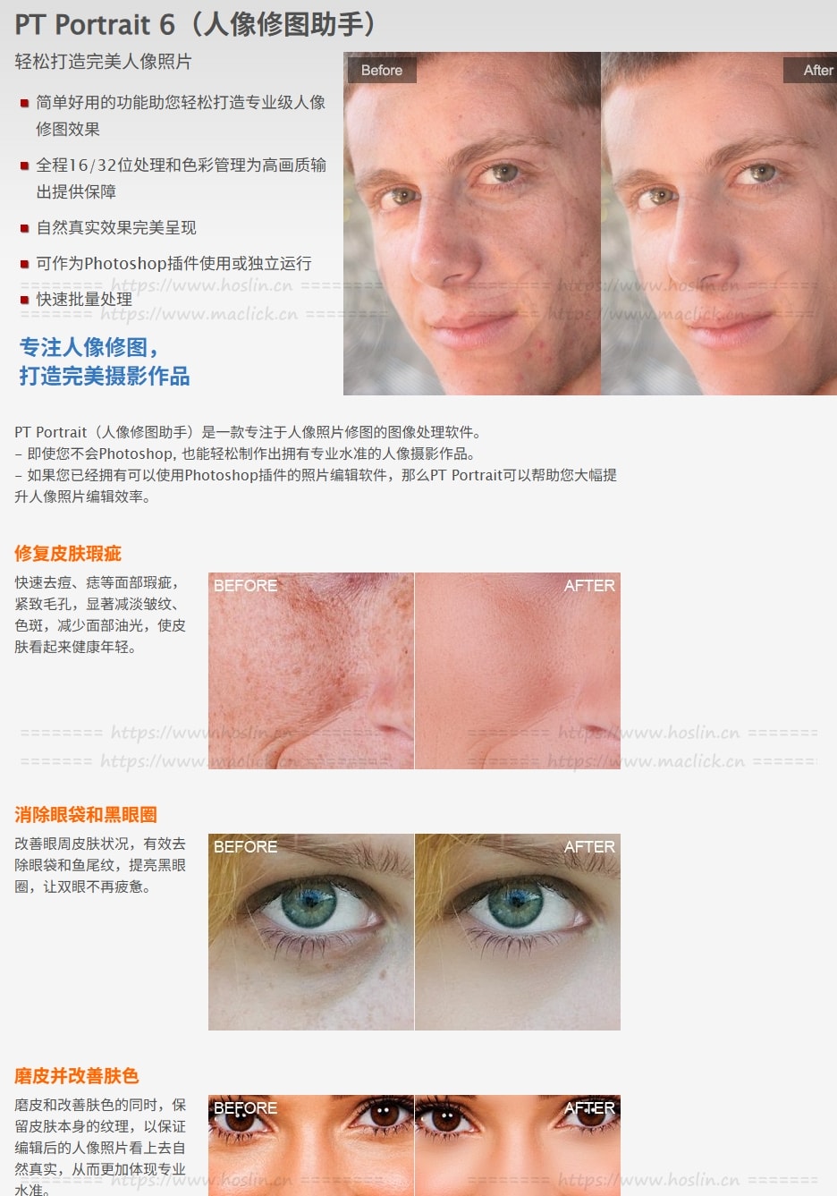 PT Portrait 6 工作室版 照片磨皮软件PT Portrait是一款专注于人像照片后制的修图软件。有了它,人像修饰变得更容易。 即使您不会Photoshop,也能轻松整修出拥有专业水准的人像摄影作品,修出自然逼真的效果。