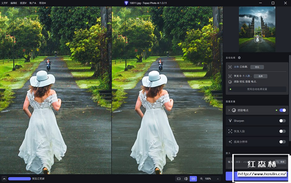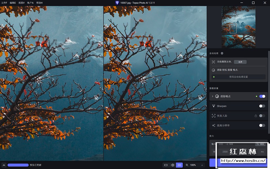 降噪(Topaz Denoise AI)在从数百万张图像中学习后,Topaz Photo AI 的降噪模块可以自动识别您图像的内容。它可以准确的确定真实图像细节和噪点之间的差异,准确度惊人。当然,并非所有图像都会有噪点,对于那些,Topaz Photo AI 将为您提供现代技术所能提供的最佳结果。