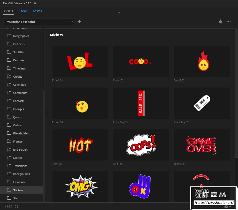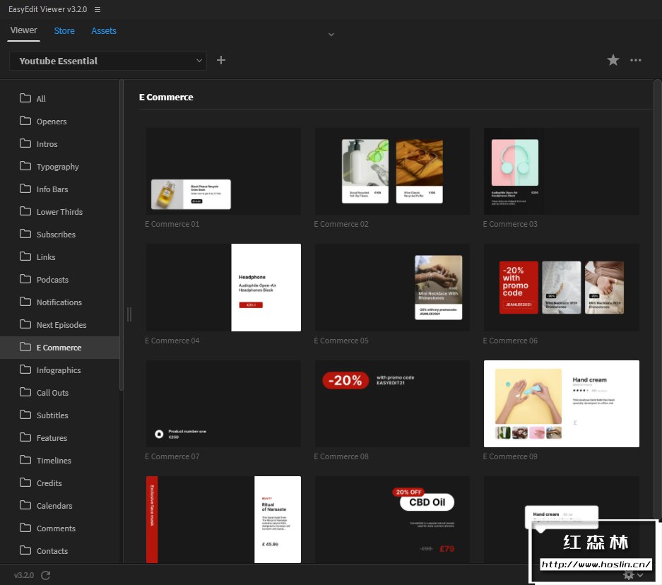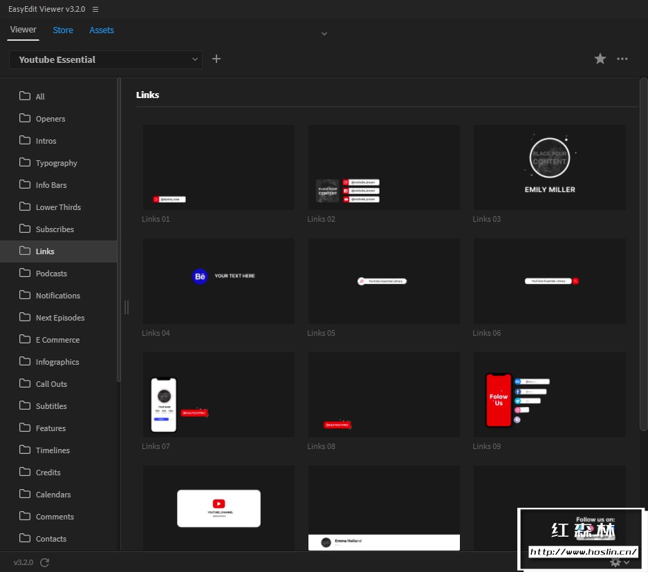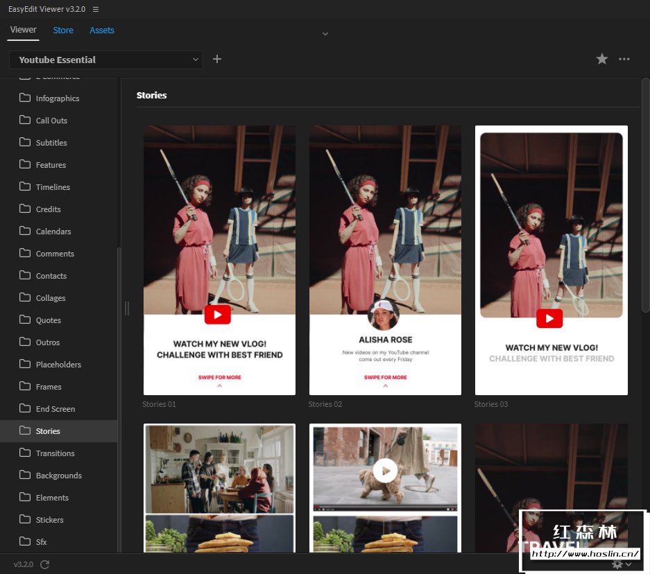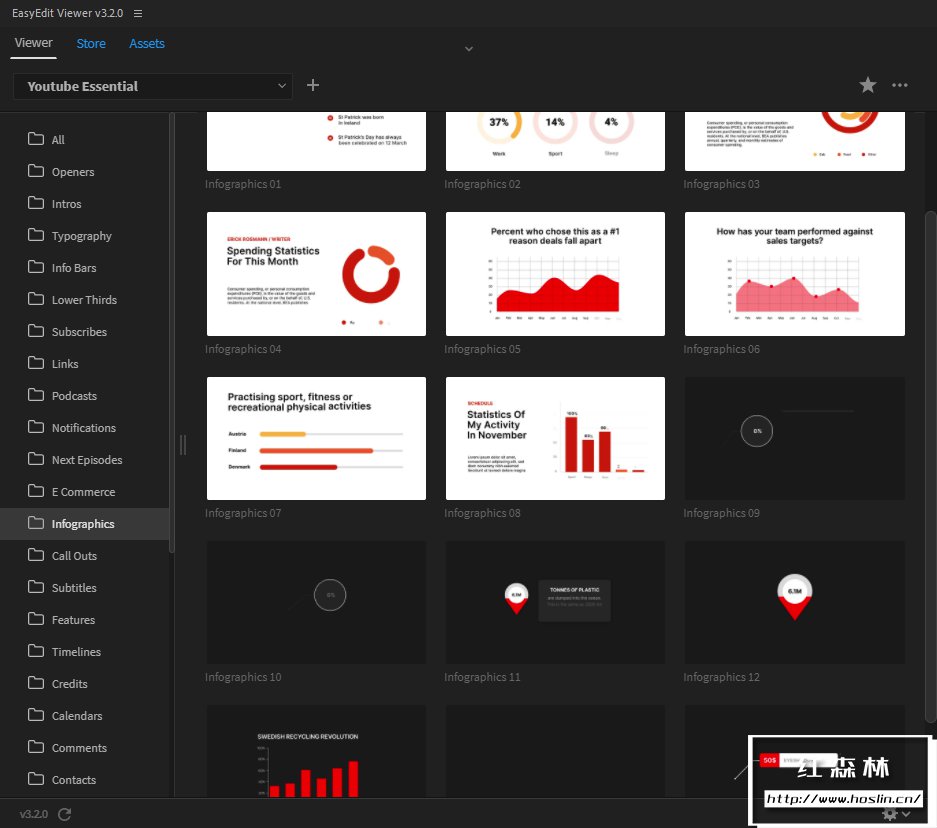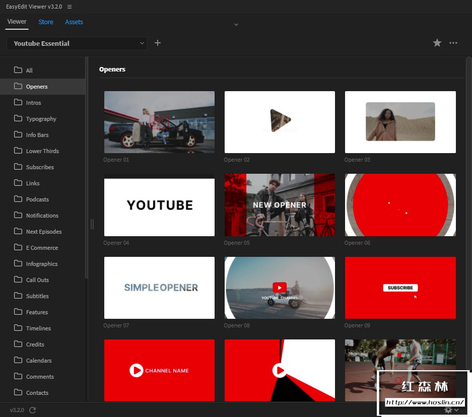 模板包括:开场片头、过渡、元素、信息栏、链接栏、下三分之二、下一集预览、评论栏、引号栏、订阅电话、印刷标题等。