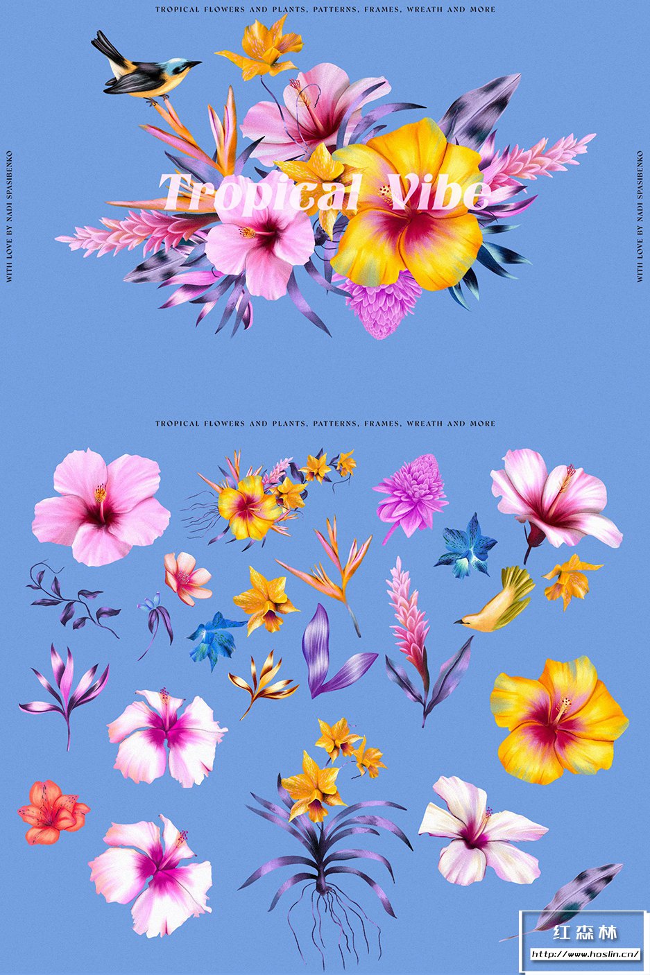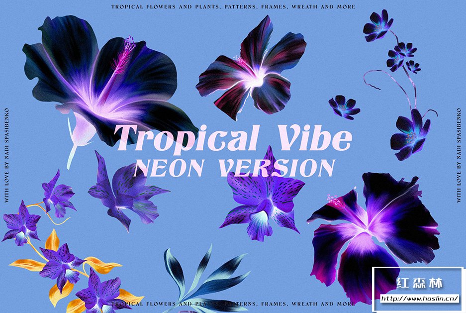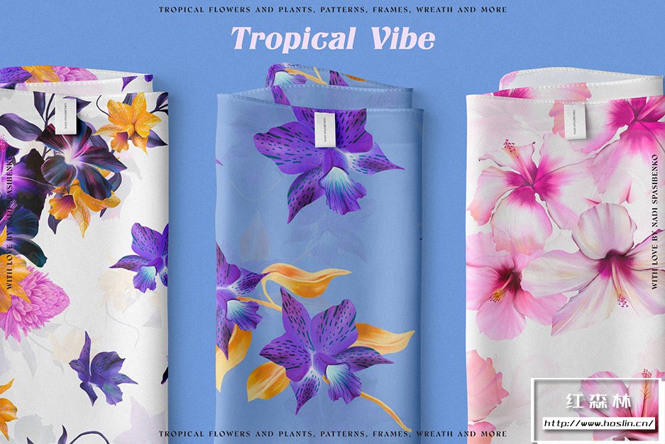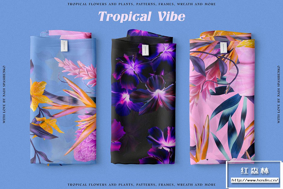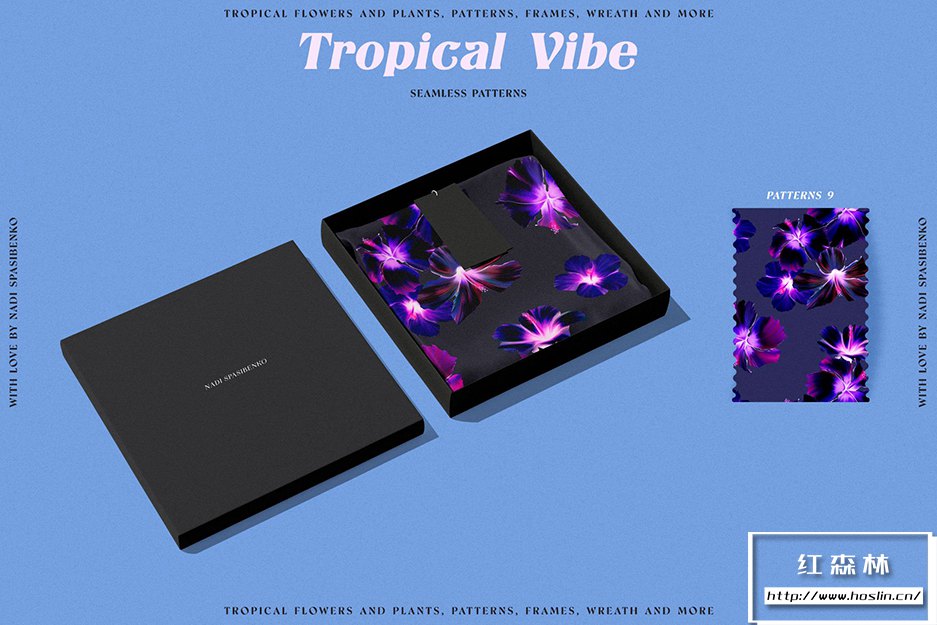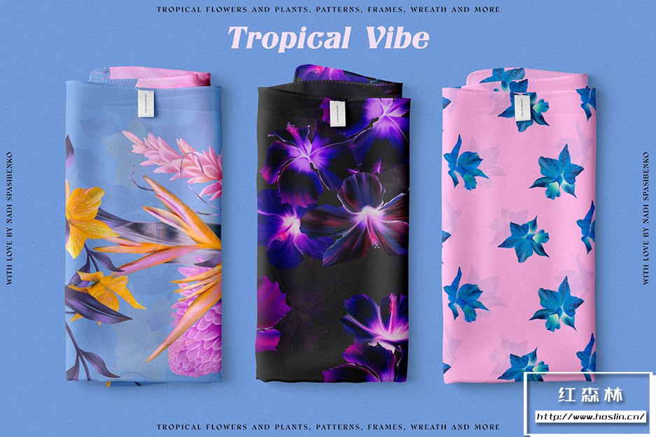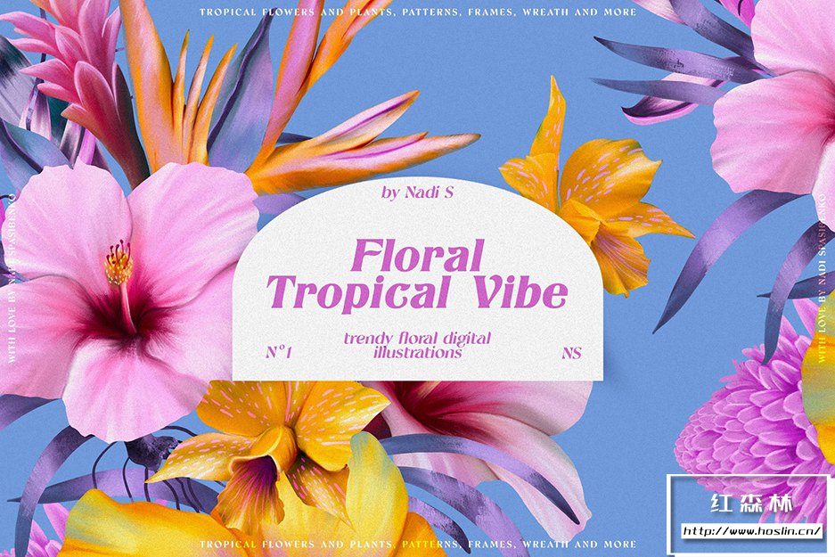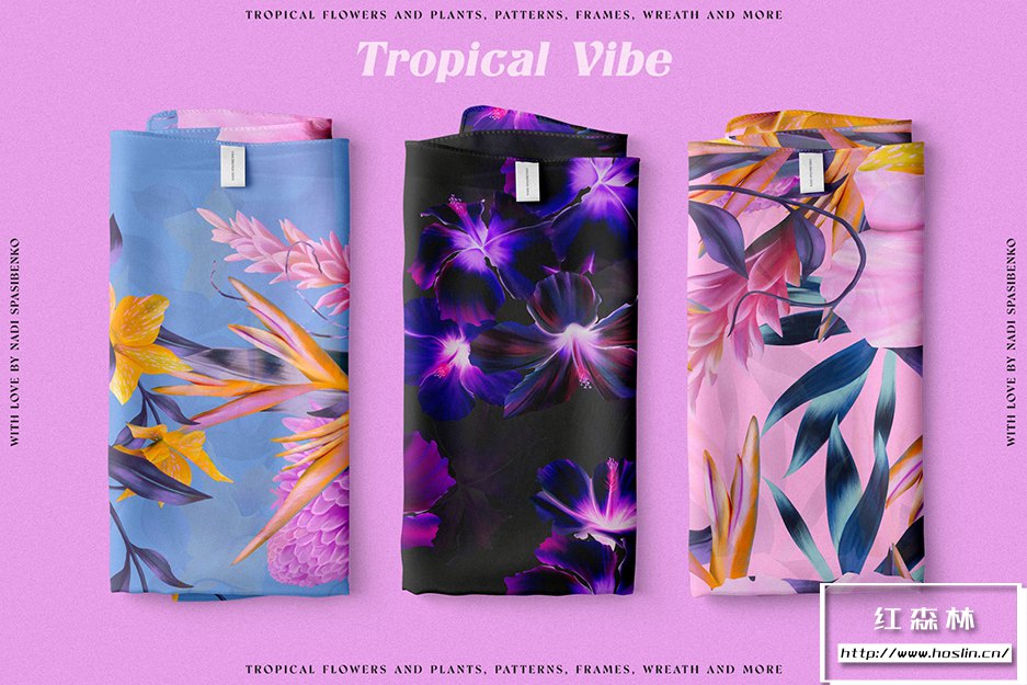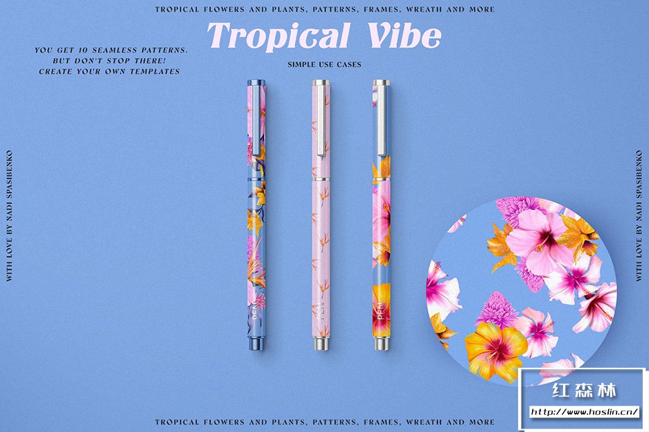 在清新时尚的夏威夷呼吸新鲜空气。使用Floral Tropical Vibe,您将获得丛林和热带花卉的新化身,明亮多汁的组合。您可以创造大胆的产品:衣服、壁纸、文具、床单和许多其他产品。您会得到颜色和花形的有趣组合。