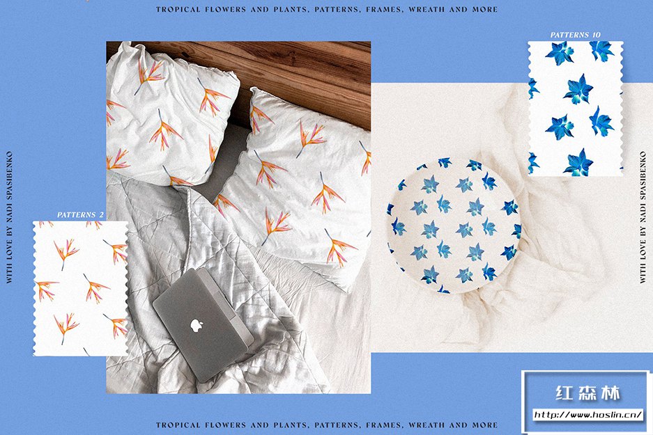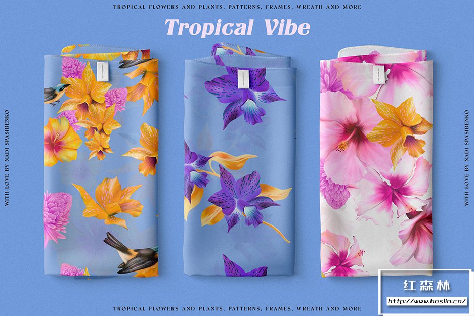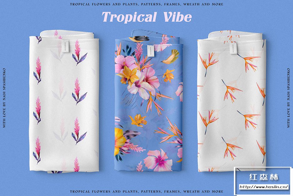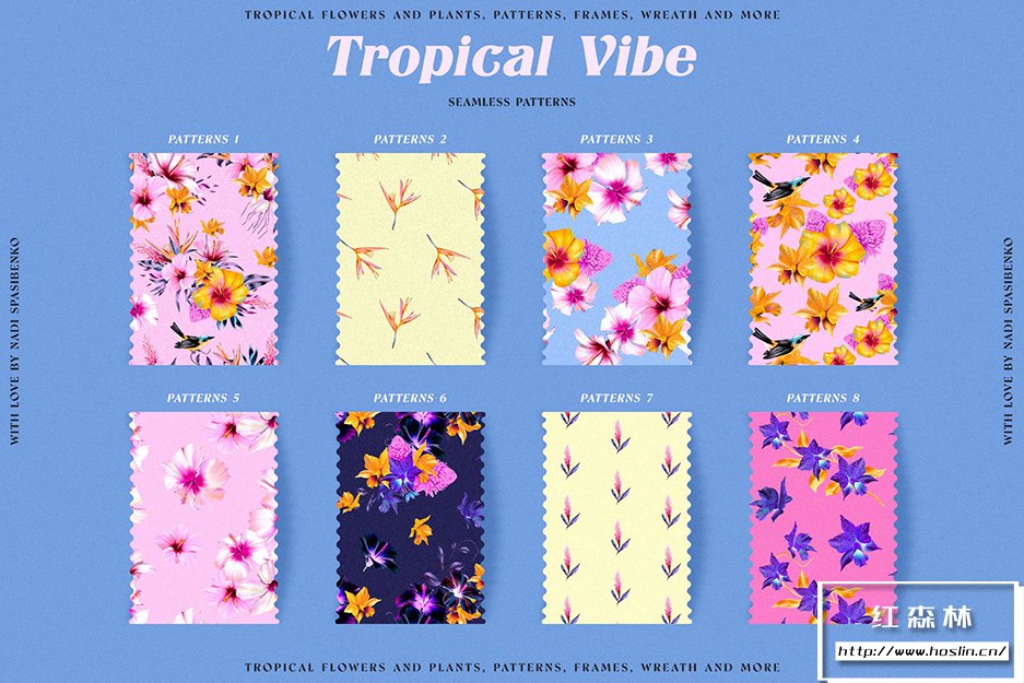 - 10个无缝美丽图案(有天堂鸟、木槿和花朵)您可以在丝巾上看到图案