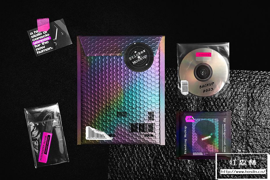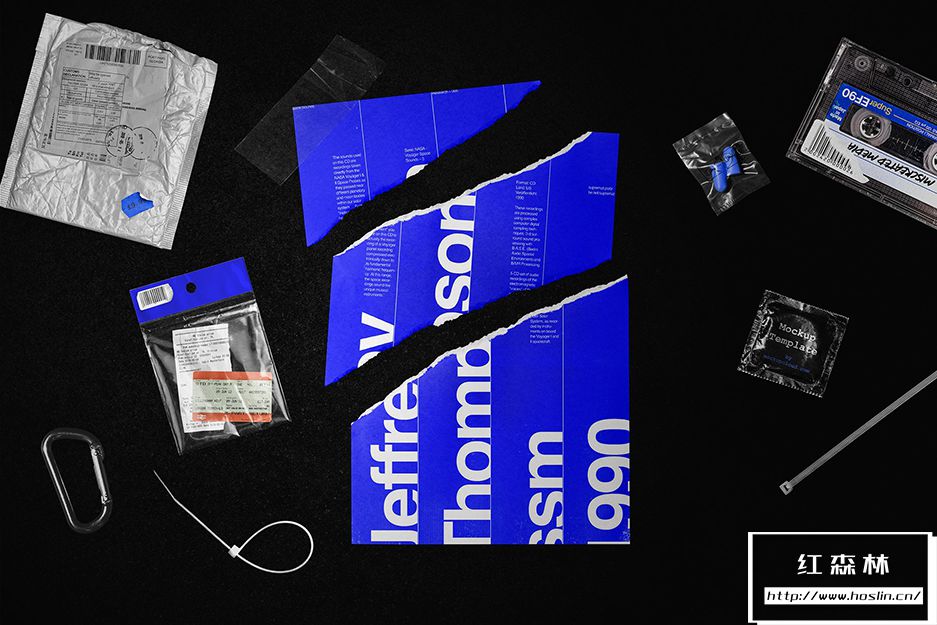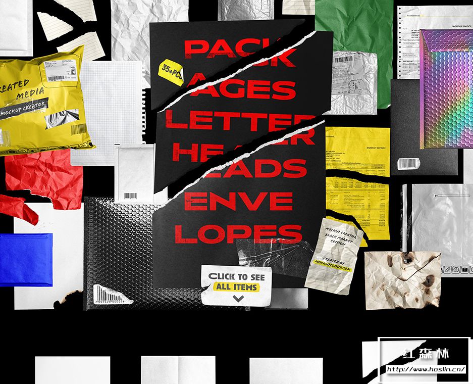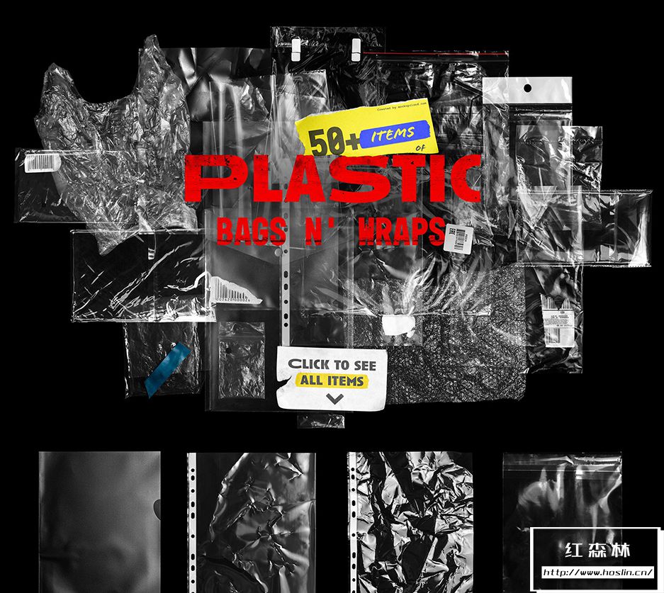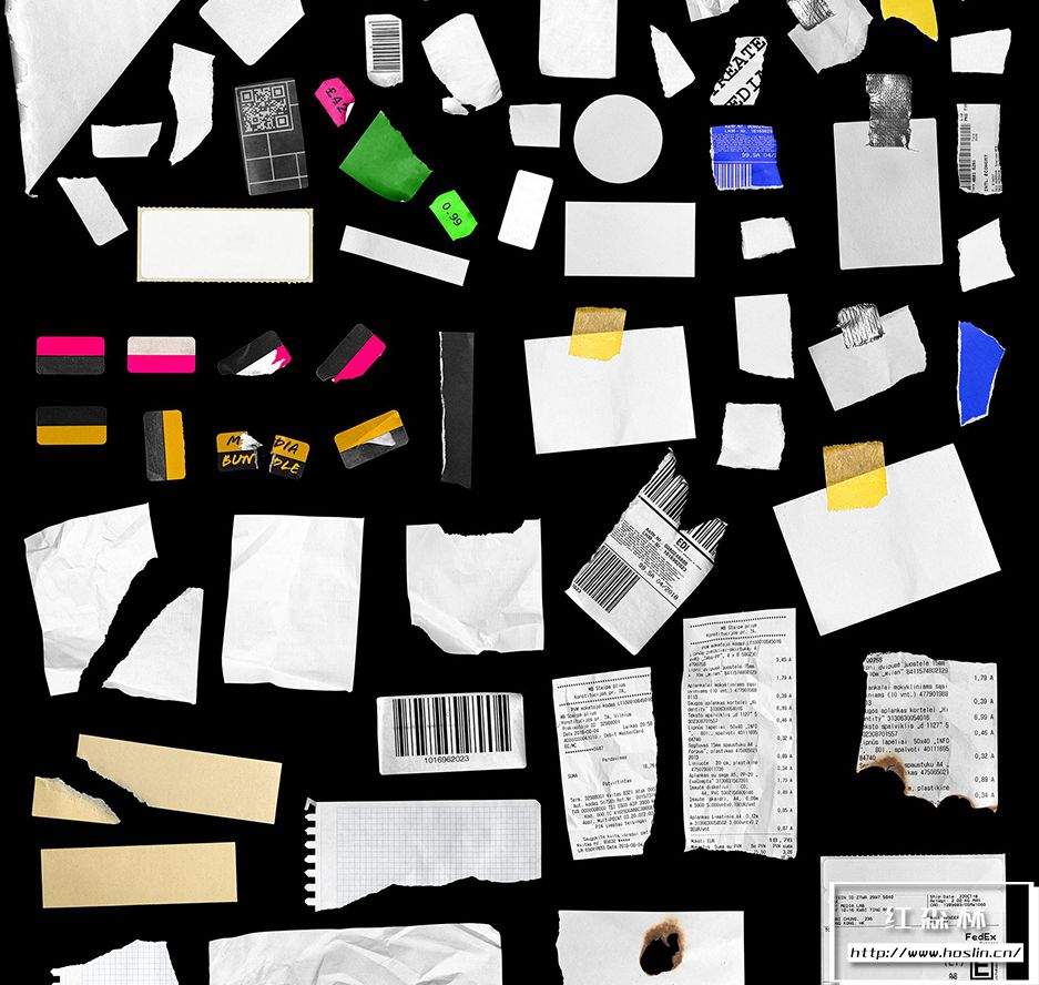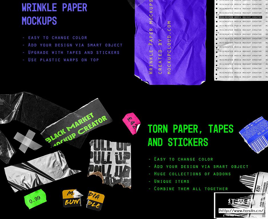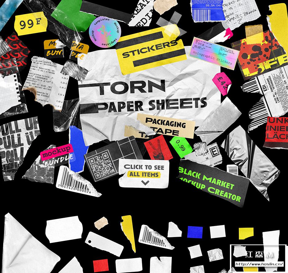 一系列独特的保鲜膜纹理、信头、海报、包装、胶带片、撕碎的纸张、贴纸以及各种时尚外观的物品。非常适合制作大胆、引人注目的当代设计。