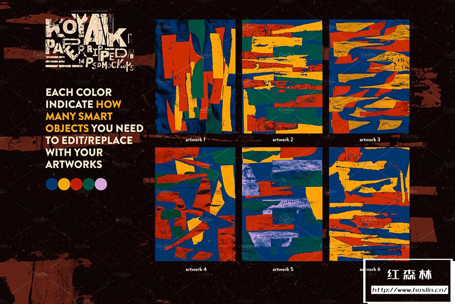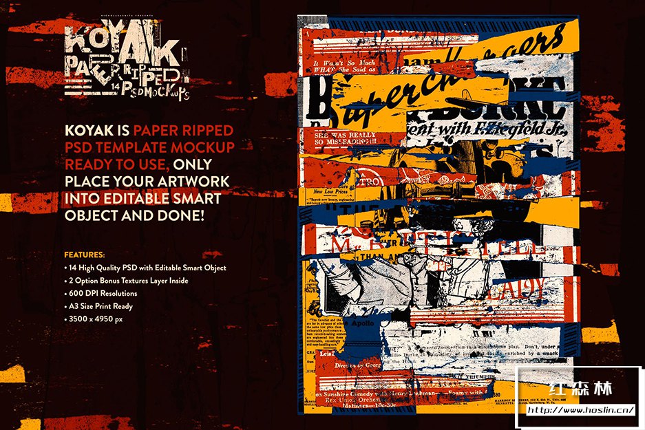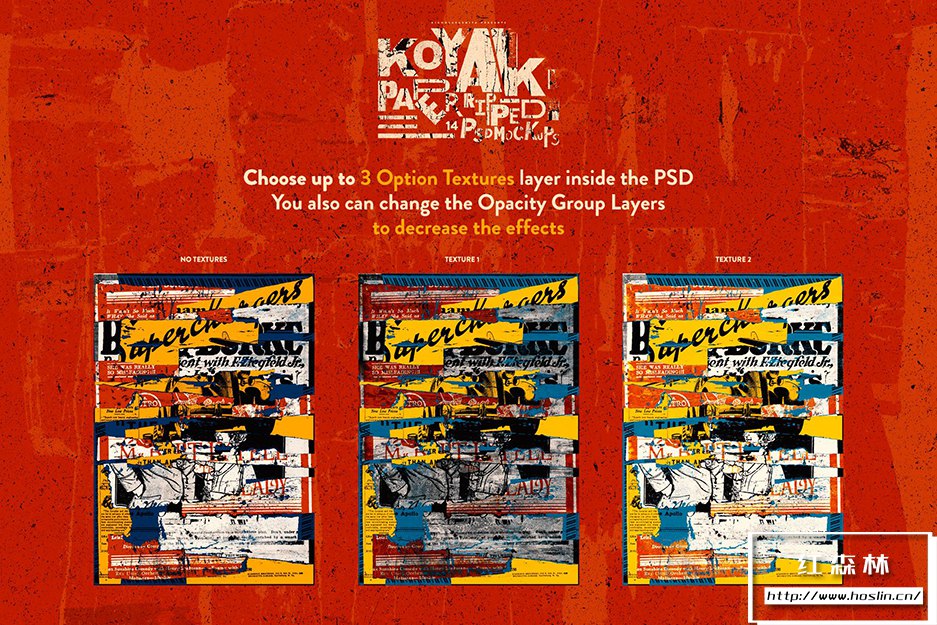 每个智能对象,您都可以用任何东西填充它,从印刷作品,或者只是抽象艺术。您可以轻松获得撕裂的纹理,无需修改,只需调整打开/关闭其中的纹理层即可。Koyak 也适用于任何一种颜色,黑色和白色,彩色也适用。模板内撕开的纸张使颜色和艺术品的动态融合成一件艺术品。
