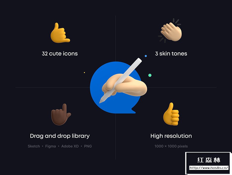 该包由 3 种不同肤色的 32 种不同手势组成,总共 96 个高分辨率、组织良好的常用图标,支持Figma、Sketch、Adobe XD、PNG和在线矢量图编辑。可以让您的下一个项目更加友好和平易近人。文件大小:53M