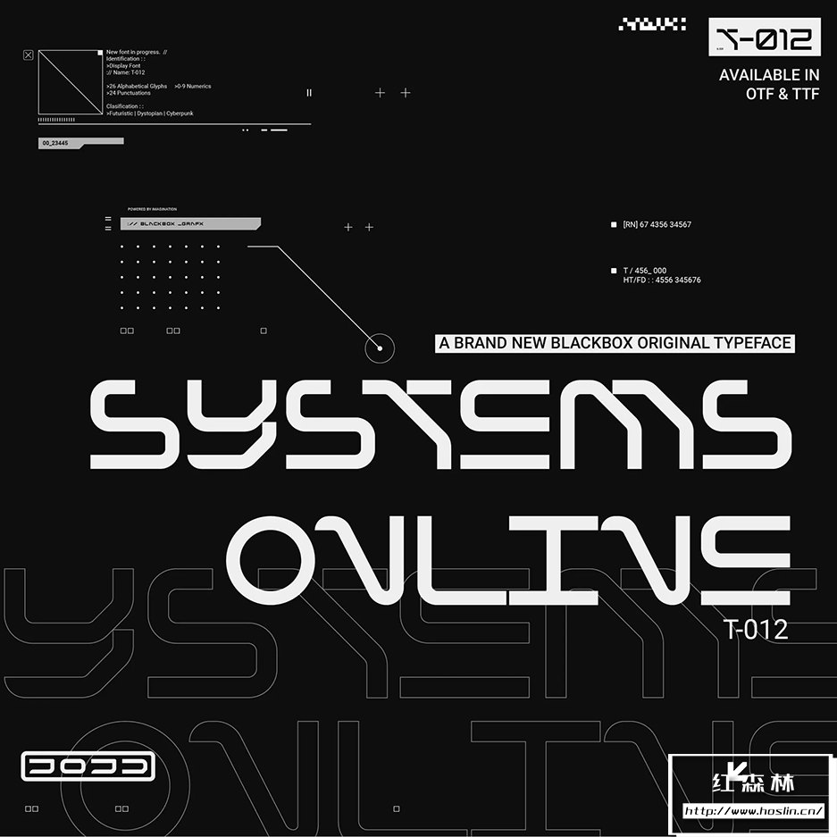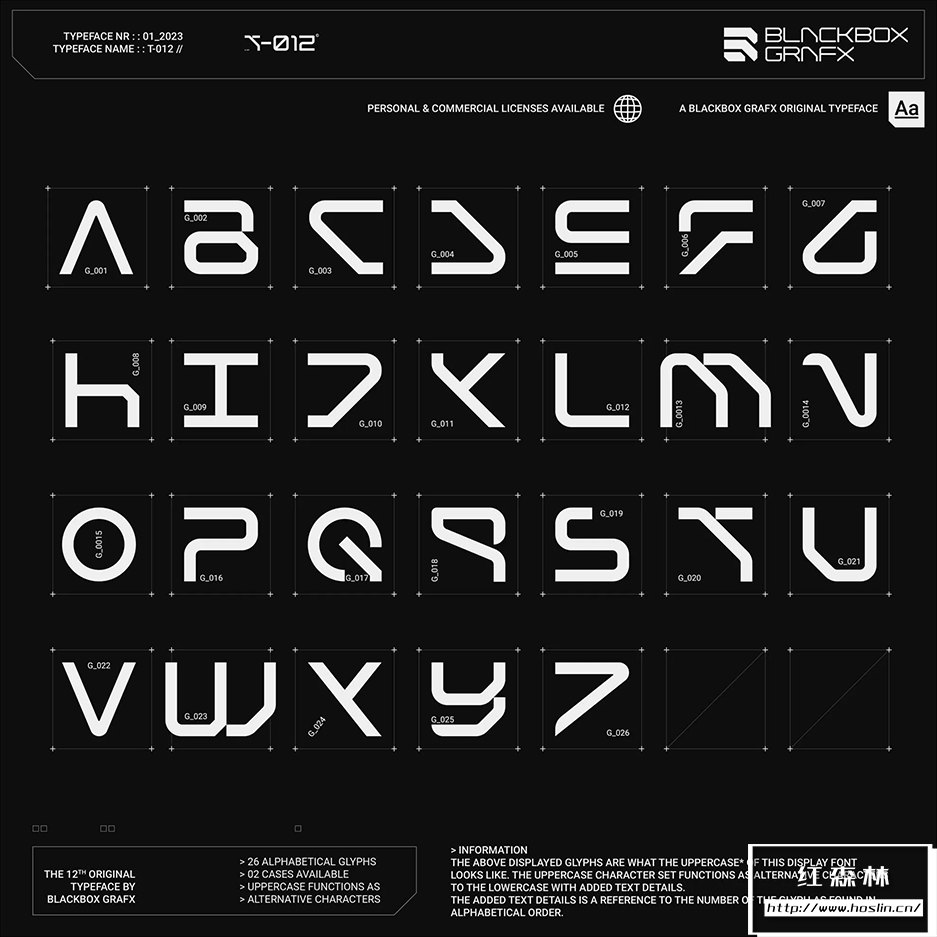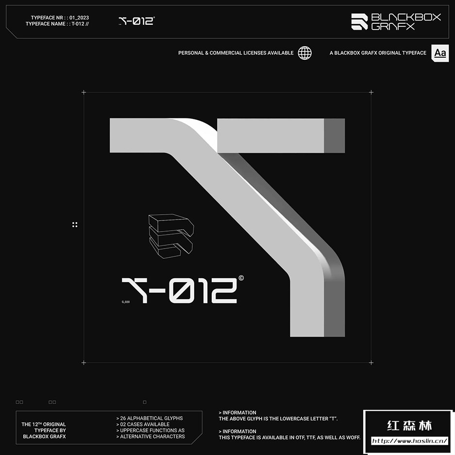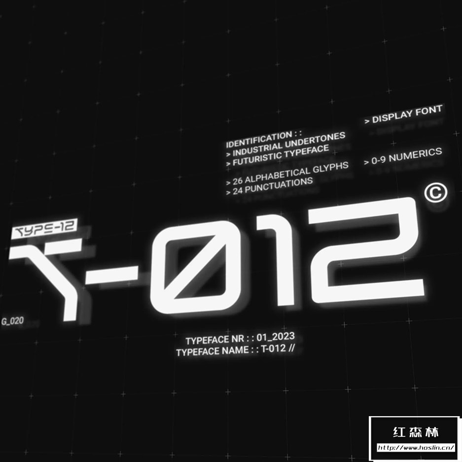 T-012字体的特点是融合了锋利的边缘和弯曲的角落。这在赛博朋克和未来主义风格化之间取得了很好的平衡,并具有明确的反乌托邦感觉,同时还保持了高端(corpo)未来主义的外观。此字体在大中型上效果最佳。