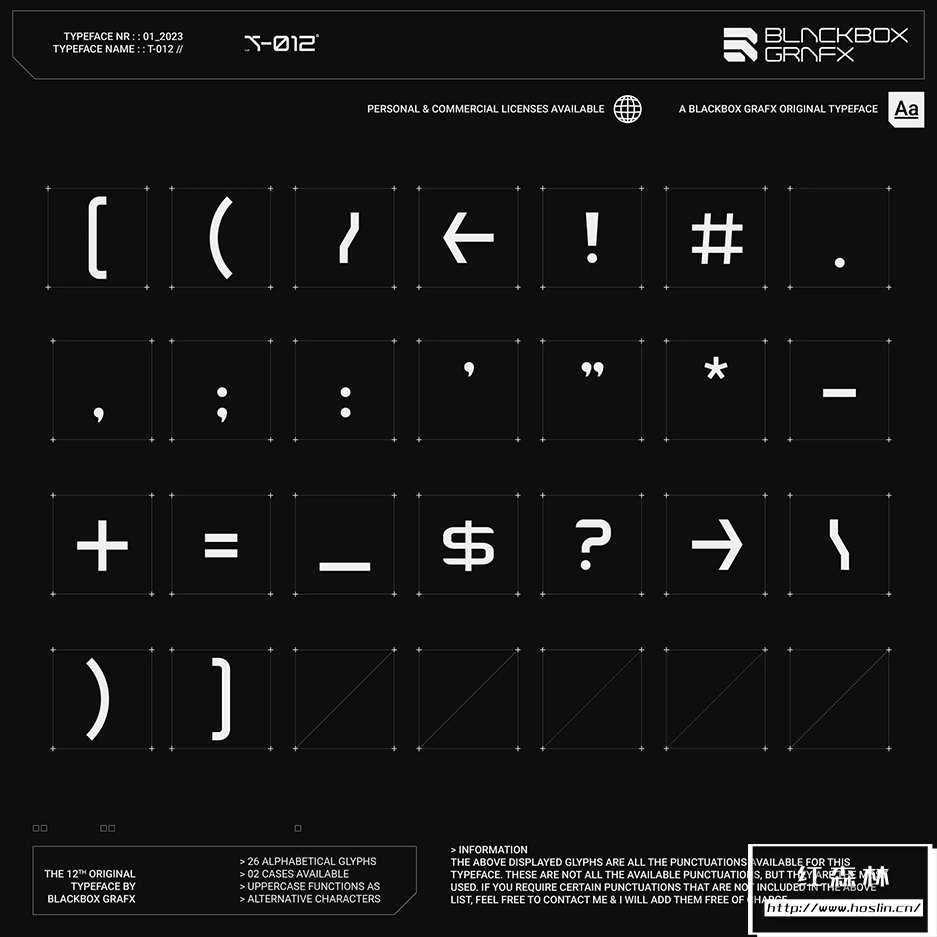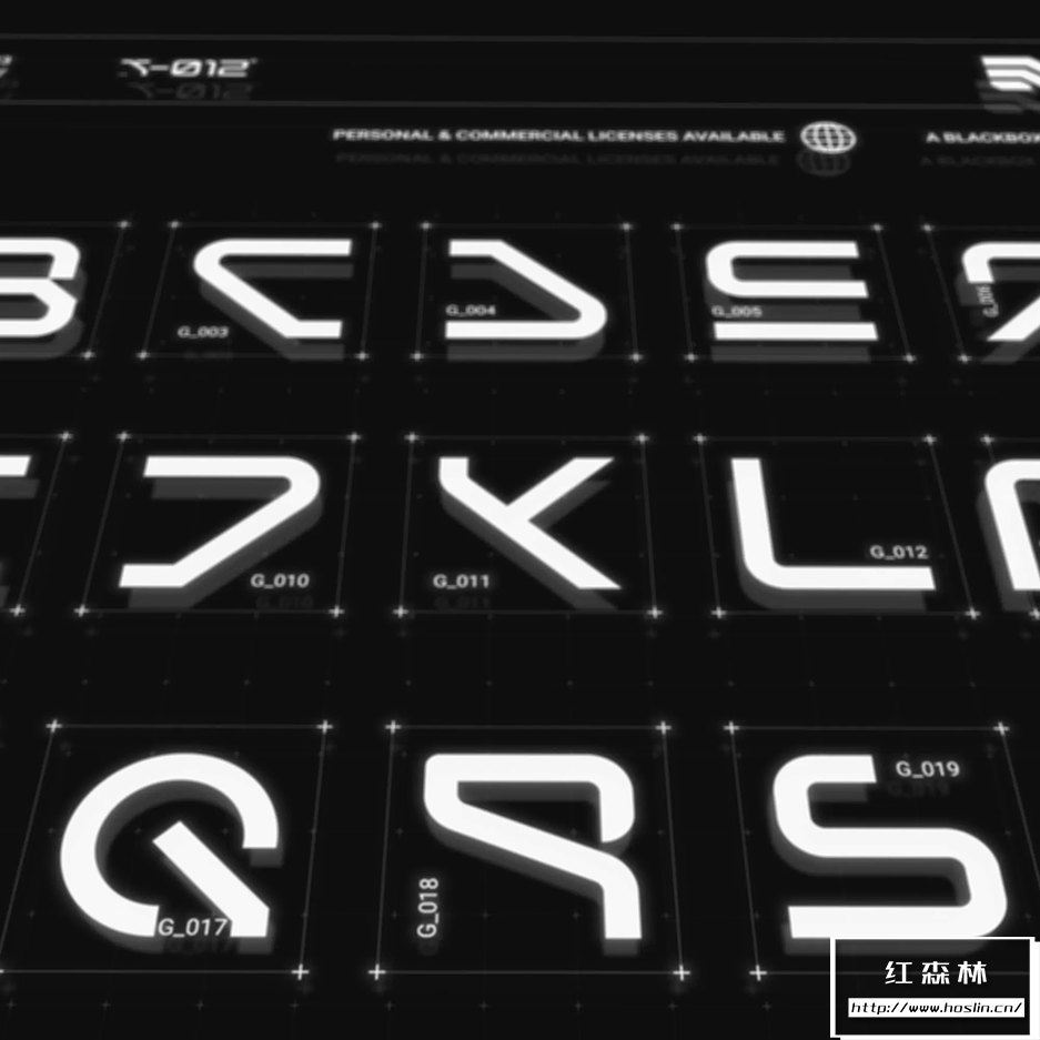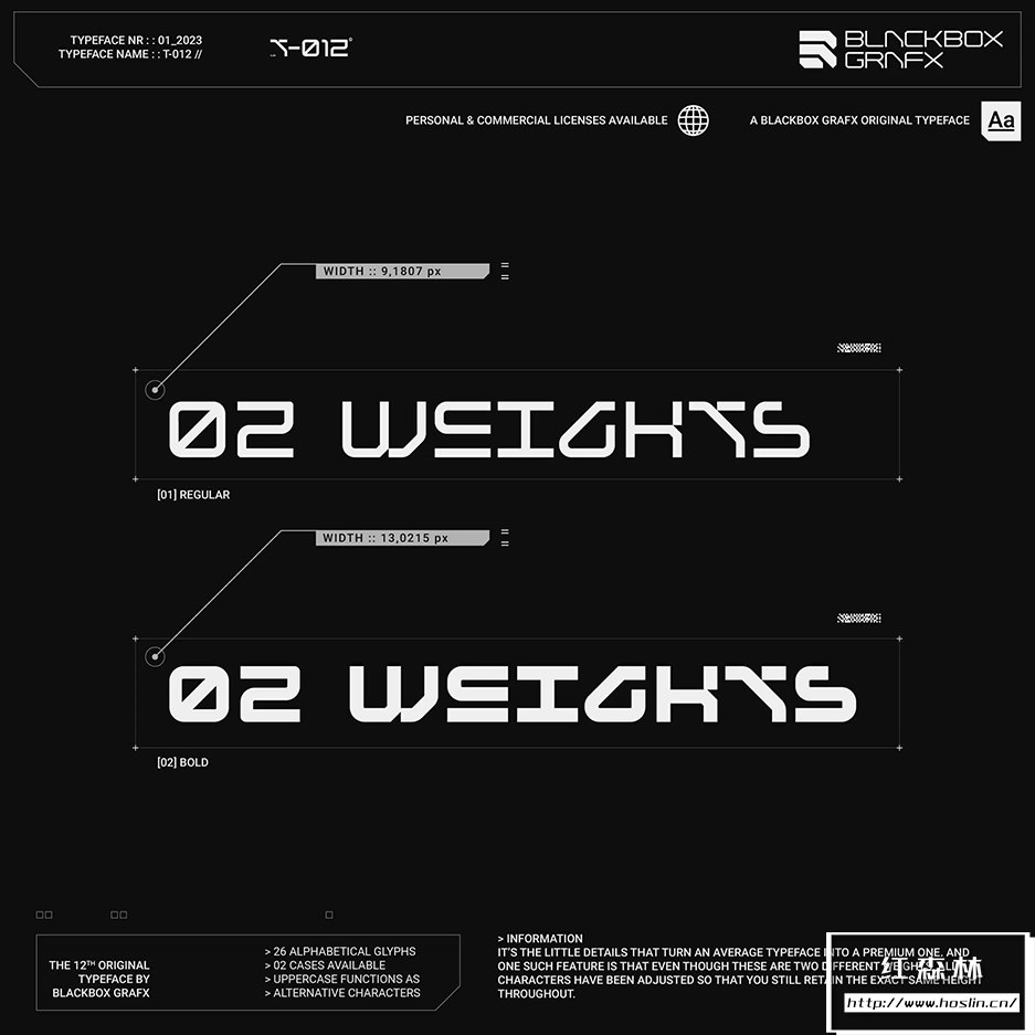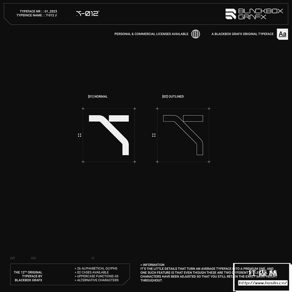 T-012字体的特点是融合了锋利的边缘和弯曲的角落。这在赛博朋克和未来主义风格化之间取得了很好的平衡,并具有明确的反乌托邦感觉,同时还保持了高端(corpo)未来主义的外观。此字体在大中型上效果最佳。