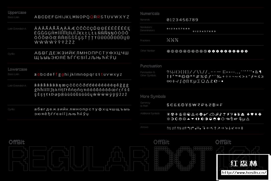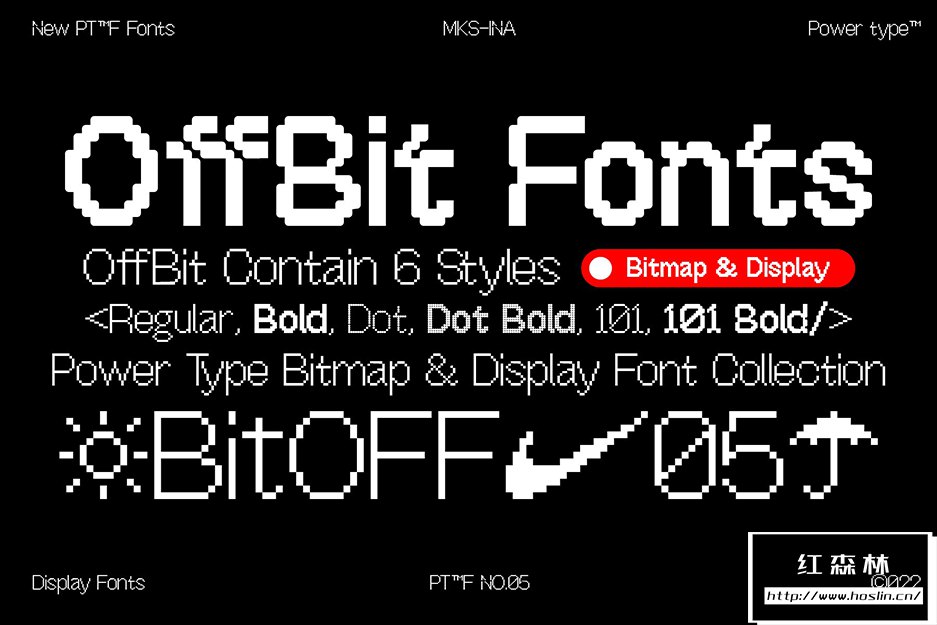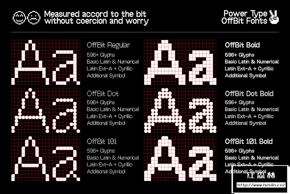 OffBit是一种从 Bitmap 派生的字体类型,每个框都有不同的变体。位图一词来自计算机编程术语,它的意思只是位图,即空间映射的位数组。现在,它与 PowerType 一起通常指的是类似的像素阵列概念,这些像素在空间上映射成各种形状,例如点和其他模型。这种字体与计算、平面设计、海报或其他媒体的主题相匹配,所有这些都可以组合。